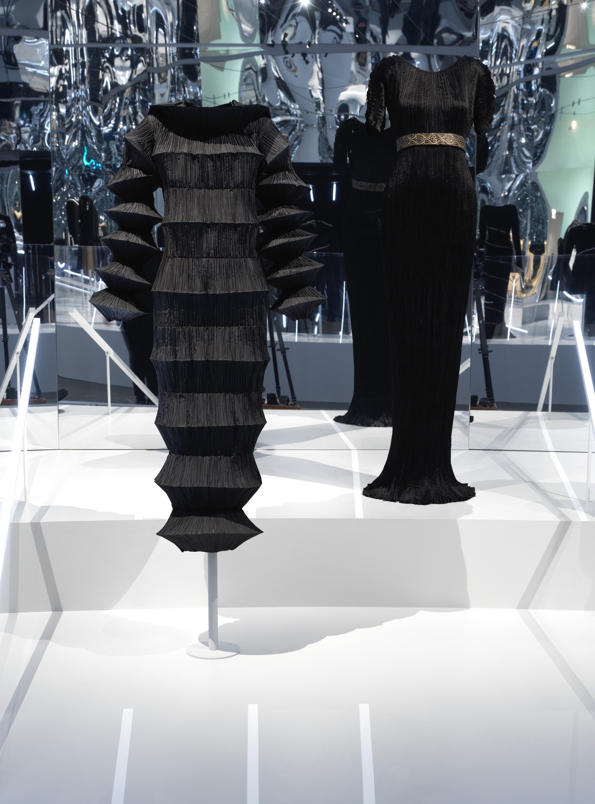 About Time: Fashion and Duration installation view featuring the “Flying Saucer” dress by Issey Miyake (left), spring/summer 1994 Courtesy Issey Miyake. Photo © The Metropolitan Museum of Art