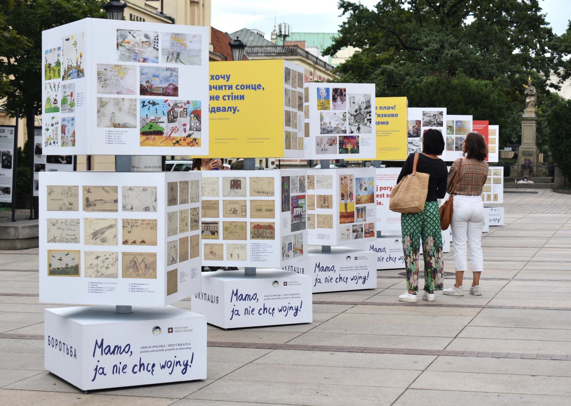 A display of the children's drawings outside the Staszic Palace in Warsaw Courtesy of the "Mom, I See War" project