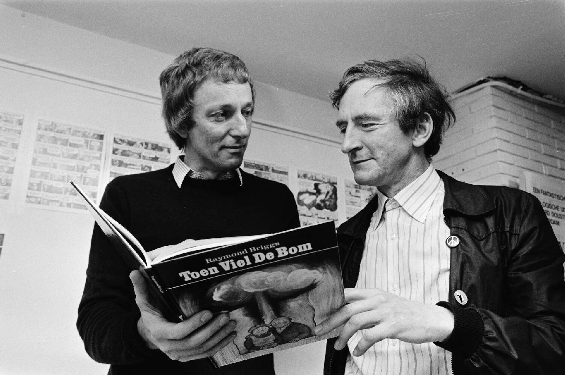 The secretary of the Inter-Church Peace Council (IKV) in the Netherlands, Mient Jan Faber (left), receiving the first copy of the comic book When the Wind Blows (called When the Bomb Fell in the Dutch version) by Raymond Briggs (right) in 1983 Photo: Dutch National Archives