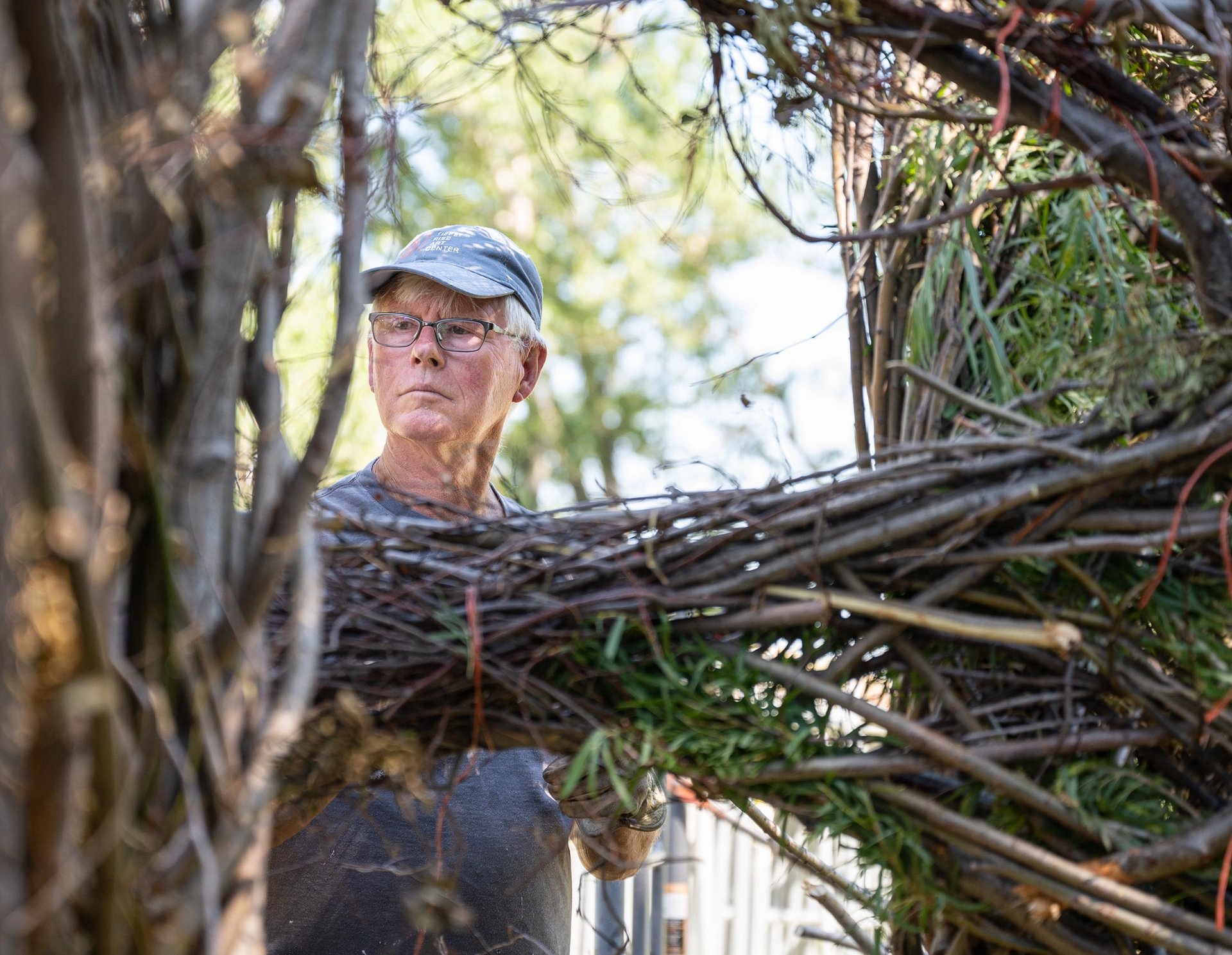 Patrick Dougherty working on Cursive Takes a Holiday (2022). Courtesy of Tippet Rise Art Center. Photo: Greys River Photography.