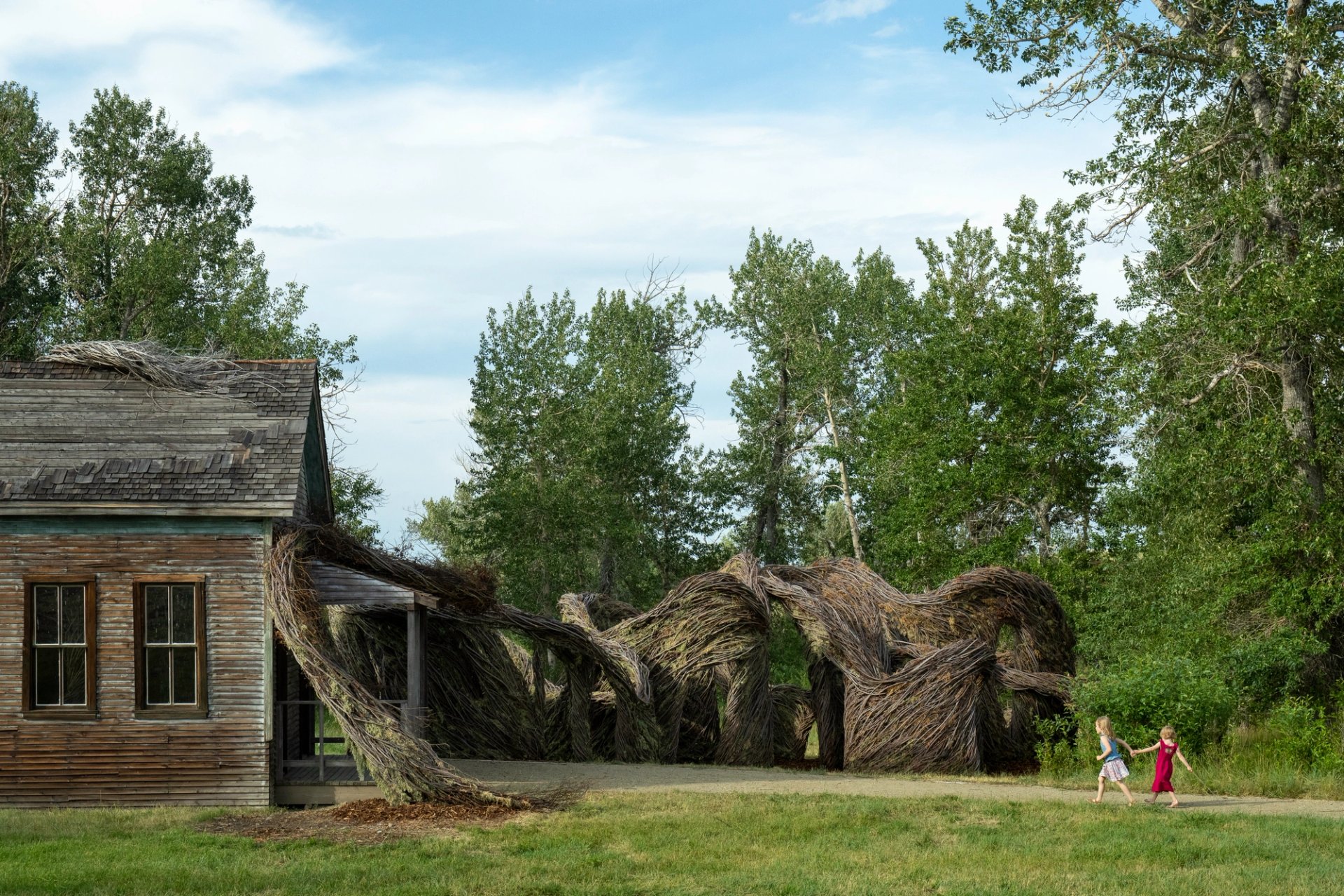 The work comprises hundreds of pounds of locally-sourced willow branches that are intertwined to create an undulating immersive environment framed by the sky and the Beartooth Mountains. Dougherty and a team of assistants and volunteers worked on the piece for three weeks—a strict deadline that the artist imposes on his laborious projects, which have been installed in institutions nationwide like the DeCordova Museum and Sculpture Park in Massachusetts and the Smithsonian Institution’s Renwick Gallery in Washington, DC.