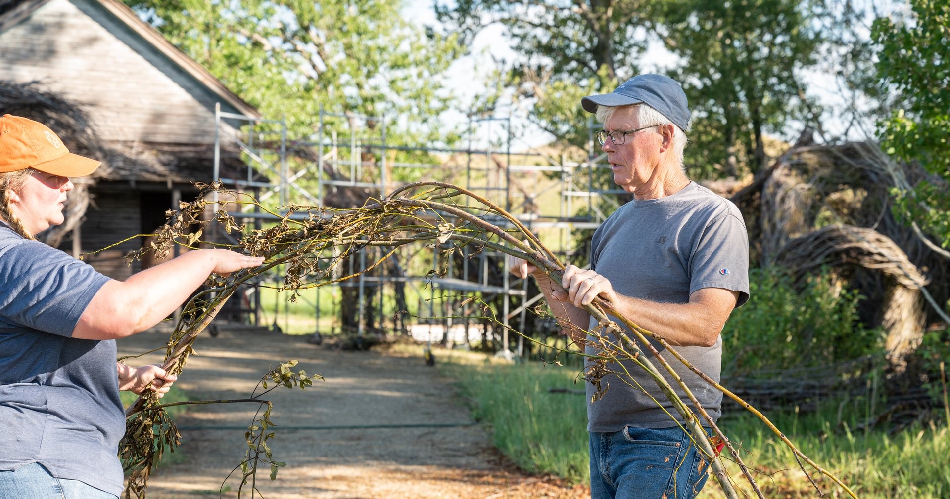 Patrick Dougherty and a volunteer working on Cursive Takes a Holiday (2022). Courtesy of Tippet Rise Art Center. Photo: Greys River Photography.