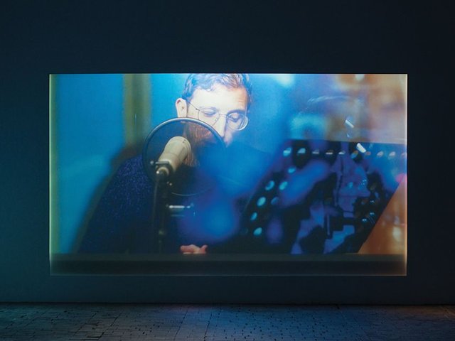 One of the possibilities offered by presenting TV-like work in an exhibition space is playing with the sense of linearity between episodes. Syms makes compelling use of the audio, with sound from one video blending into that of another. The steel structure that cuts across the space —painted a deep purple (Syms has said that her signature use of this tone forces people to say “the colour purple” aloud, referencing Alice Walker’s famed 1982 novel)—also allows for easy movement between episodes in any order: although placed chronologically, moving from right to left, the screens are installed on either side of the framework, and gaps between the girders make for easy passage from one viewing area to another.