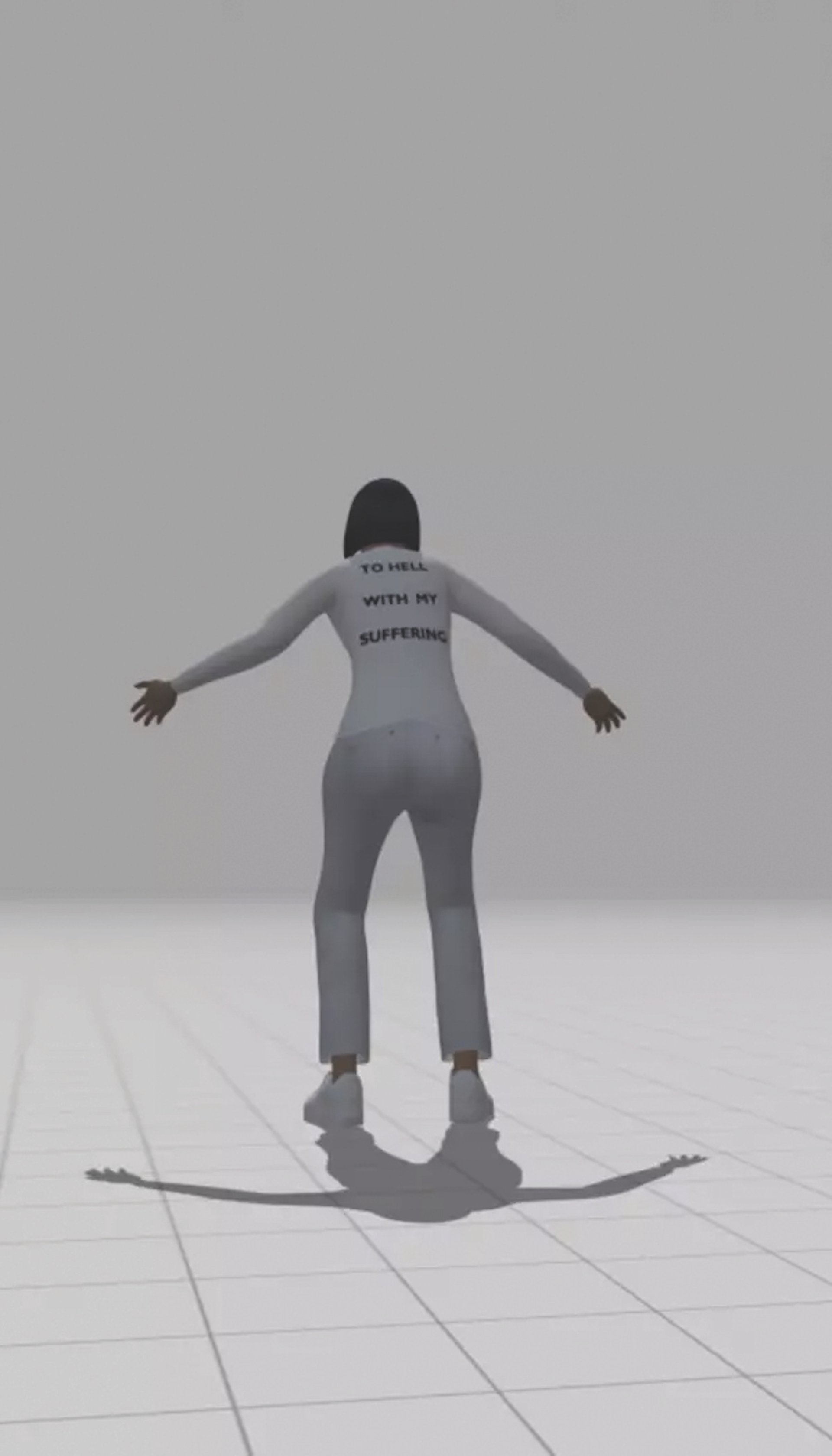 This makes sense, given Syms’s ongoing focus on everyday narratives in Black cultural production. In her 2013 work The Mundane Afrofuturist Manifesto she critiques the central tenets of Afrofuturism (“the connection between the Middle Passage and space travel is tenuous at best”) and praises a sort of quotidian Blackness instead. In a cultural context that too often presents Black characters as perennial “others”, sensationalises Black suffering or erases identity and structural violence altogether, Syms is interested in the political possibilities of a Black banality. In Intro to Threat Modeling (2017), a 3D-modelled representation of the artist dances around in a T-shirt emblazoned with the text “To Hell With My Suffering”.