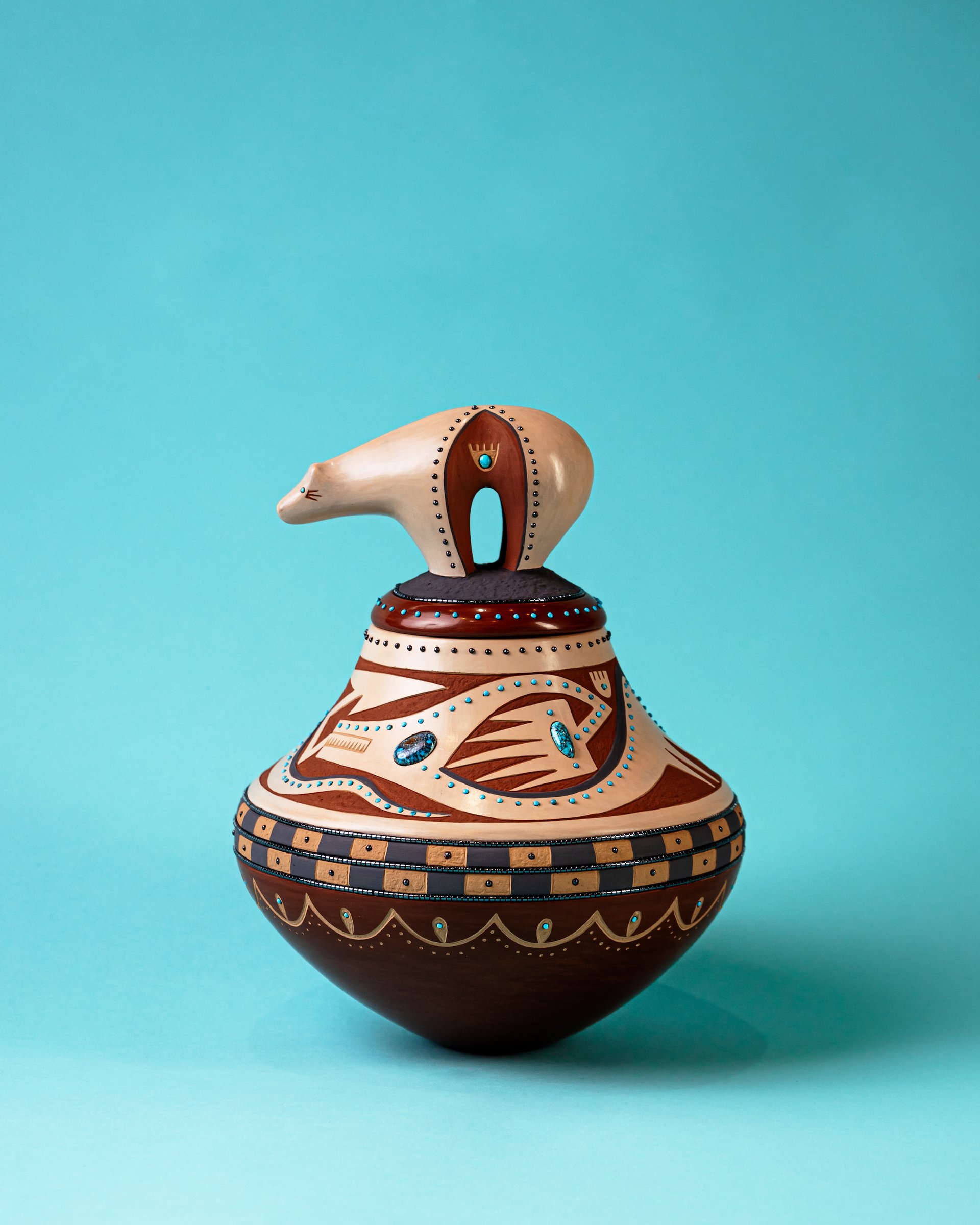 In keeping with tradition, the organisation held all of the usual ceremonies, opening the sprawling annual fair for Indigenous art with a morning prayer and proffering this year’s juried “Best-of-Class” awards across ten categories. Russell Sanchez, a San Ildefonso Pueblo potter native to the region, took home the event's “Best-of-Show” prize for his bejewelled polychrome jar, 100 years in the making! (2022).