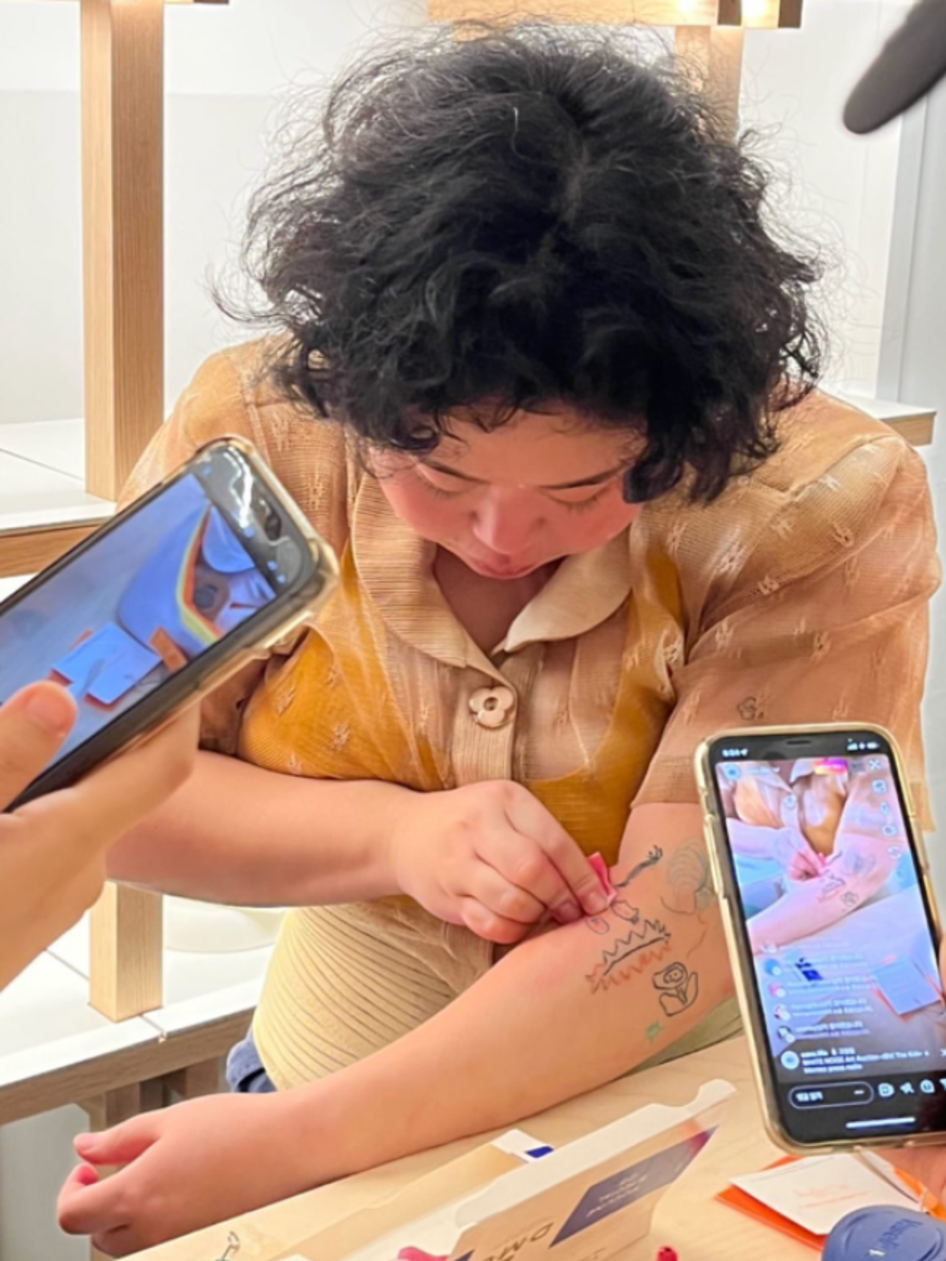 Rondi Park tattooing herself at White Noise's inaugural auction.