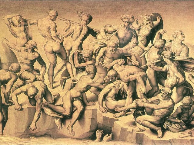 Crucially, the colossal head is similar in appearance to Michelangelo’s statues of St Paul and Peter (1501-4), made for an altar in Siena cathedral. “The heads are very classical in style and that also fits the Dante passage where, still hesitating, he says, ‘I am not Aeneas, nor St Paul.’ So Dante is saying I’m not one of these great figures,” Hall says. “But that is what he becomes when he enters Hell. So too Michelangelo when he makes vast works that surpass antiquity.”