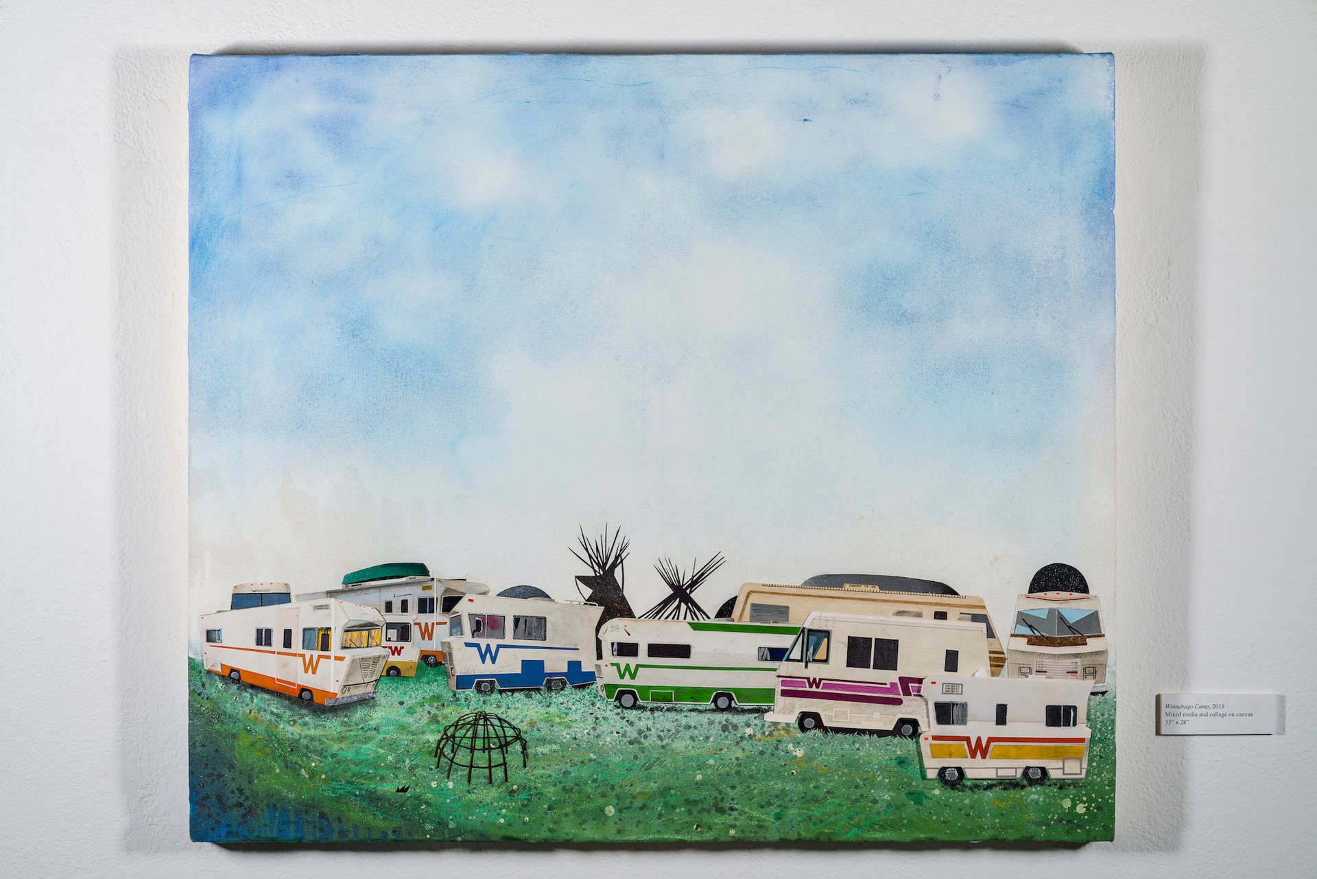 K Art Gallery will also show mixed-media collages on canvas by Henry Payer (Ho Chunk) that explore themes related to cultural stereotypes and the post-reservation period. Works like Winnebago Camp (2019), which use the Winnebago motorhome as a symbol of the displacement of the Winnebago Tribe of Nebraska, have a “satirical humour that people have really responded to”, Kimelberg says.
