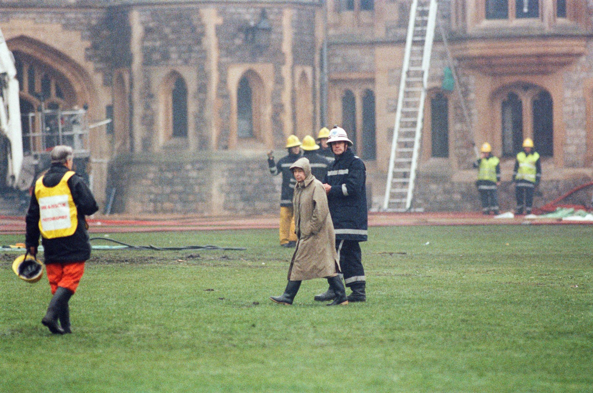 The Queen is escorted by the chief fire officer around the grounds of Windsor Castle, 20 November 1992, following the catastrophic fire in the state apartments Trinity Mirror / Mirrorpix / Alamy Stock Photo