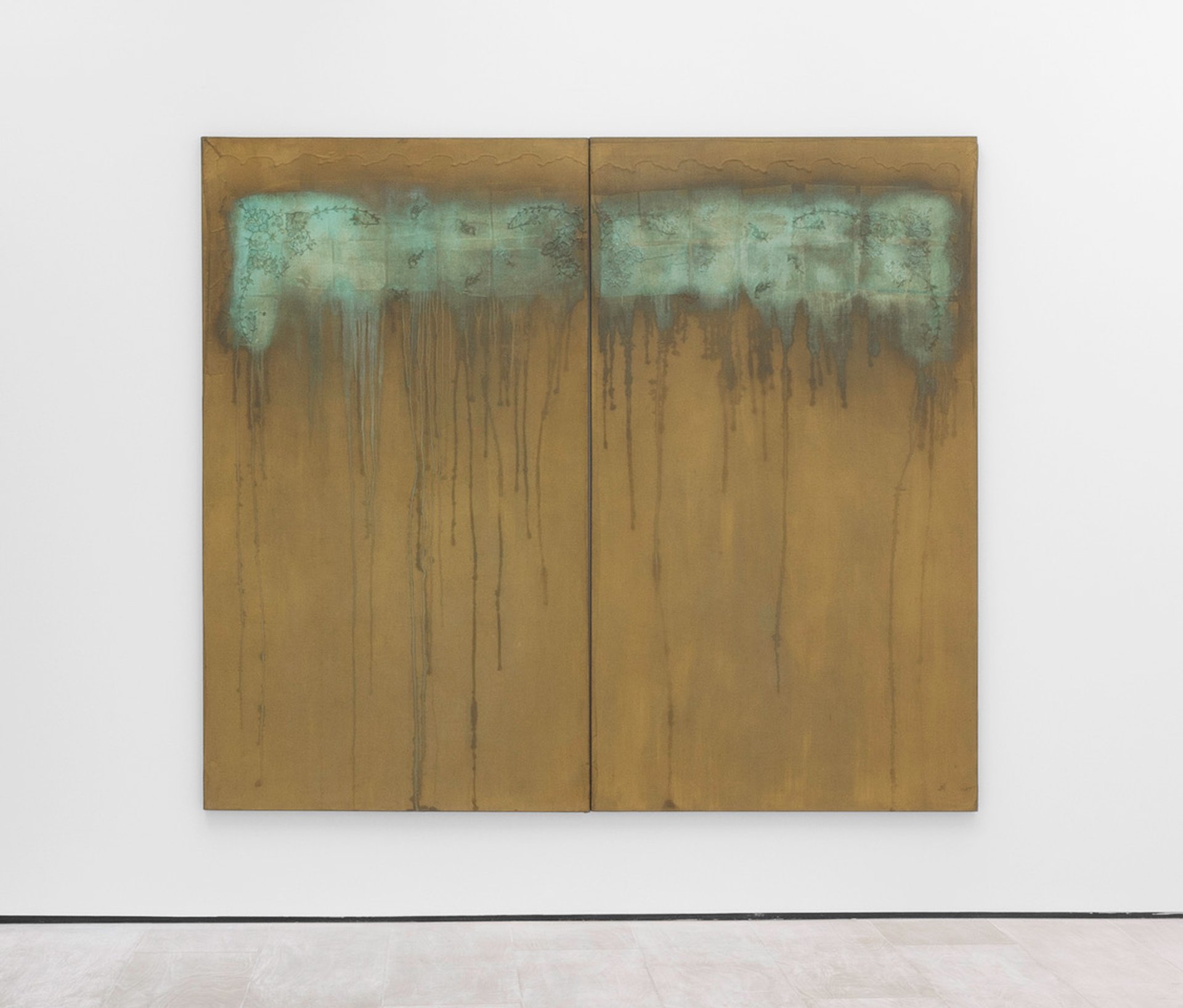 Like unusual choices of medium, some themes reached across different stands in the Focus section to somehow form a unified idea. A few of the section's exceptional stands are entirely devoted to, or feature works that were made in the 1990s. In London-based Cecilia Brunson Projects' stand, two works by the artist Katie van Scherpenberg that were made during that decade not only continue a textural trend that was present throughout the section but also kicked off an interesting trip three decades into the past. Van Scherpenberg, while born in São Paoulo, Brazil, lived for years with her parents on a small island in the Amazon purchased by her father. When her mother decided enough was enough, she left Van Scherpenberg and her father, but not before gifting the artist with her trousseau bed linen. Twenty years later, the artist used the linen in the works on view, attaching them to the canvas and colouring them with bronze and copper oxides that, overtime, have begun to turn a pallid green. Beneath the metallic-looking surface, the embroidered bed linens can be seen, slowly being enveloped by oxidizing colour. Two of Van Scherpenberg's works on the stand had been sold by early afternoon during the VIP preview on 8 September (the gallery declined to disclose prices).