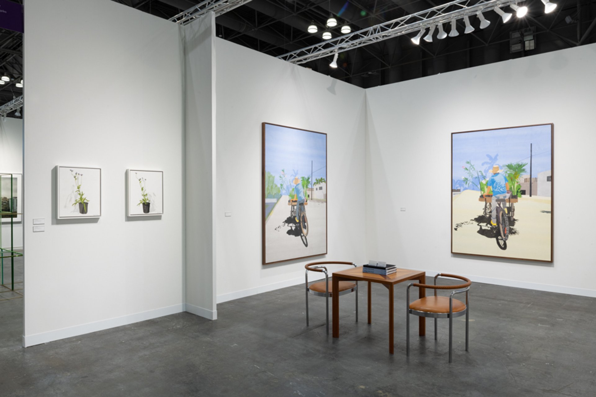 Many of the fair's most powerful works are found in the Focus section, which was organised by Museum of Contemporary Art Chicago curator Carla Acevedo-Yates. At Sean Kelly Gallery’s stand in that section there are three nearly-seven-foot-tall works by Hugo McCloud that almost perfectly summarise the interlacing of the Latin American and Black art that was on view. Each depicts a man, presumably older but you cannot see his face, rides a rickety bicycle to which a large shallow crate has been attached—he is delivering flowers. The $200,000 works speak to the value of labour and the stark difference in social economics. More importantly, there’s an environmental aspect to the work. McCloud collects single-use plastic bags that would otherwise end up in landfills then adheres them to the canvas through a heat transfer process. This creates a delicate texture to the works that only enhances their message.