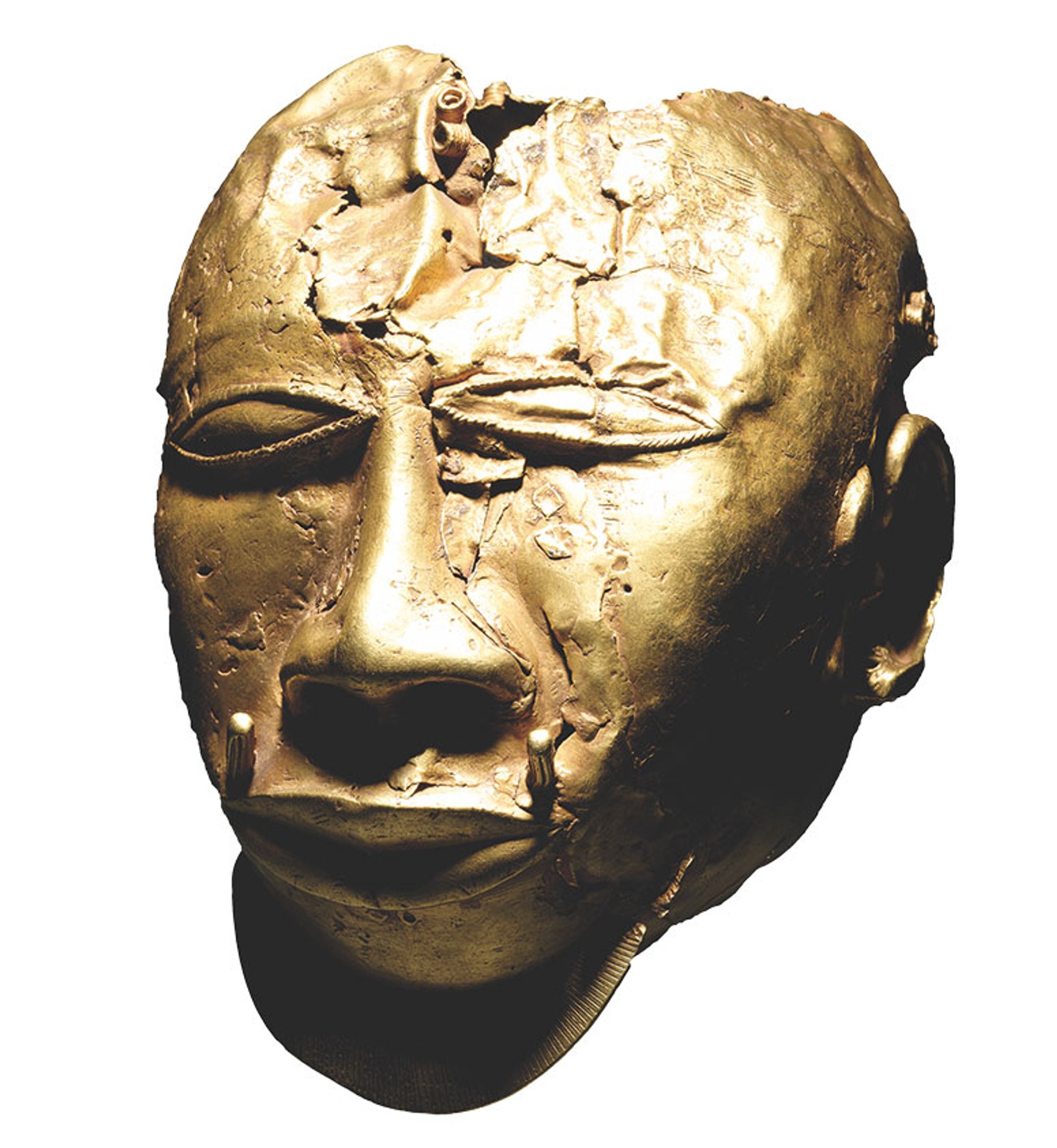 They include a decorated gold pectoral “soul” disc, shaped like a flower, which would have been worn by priests involved in the ritual purification of the king’s soul. There is a also a pear-shaped pendant, either worn or possibly attached to a state sword or stool. The remaining pieces of regalia are of gold.