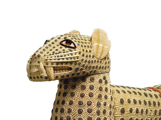 The Royal Regiment of Artillery is believed to own an important Asante gold ram’s head. It is set on an elaborate stand, made in London in 1875, which includes three Atlantean figures of Africans.