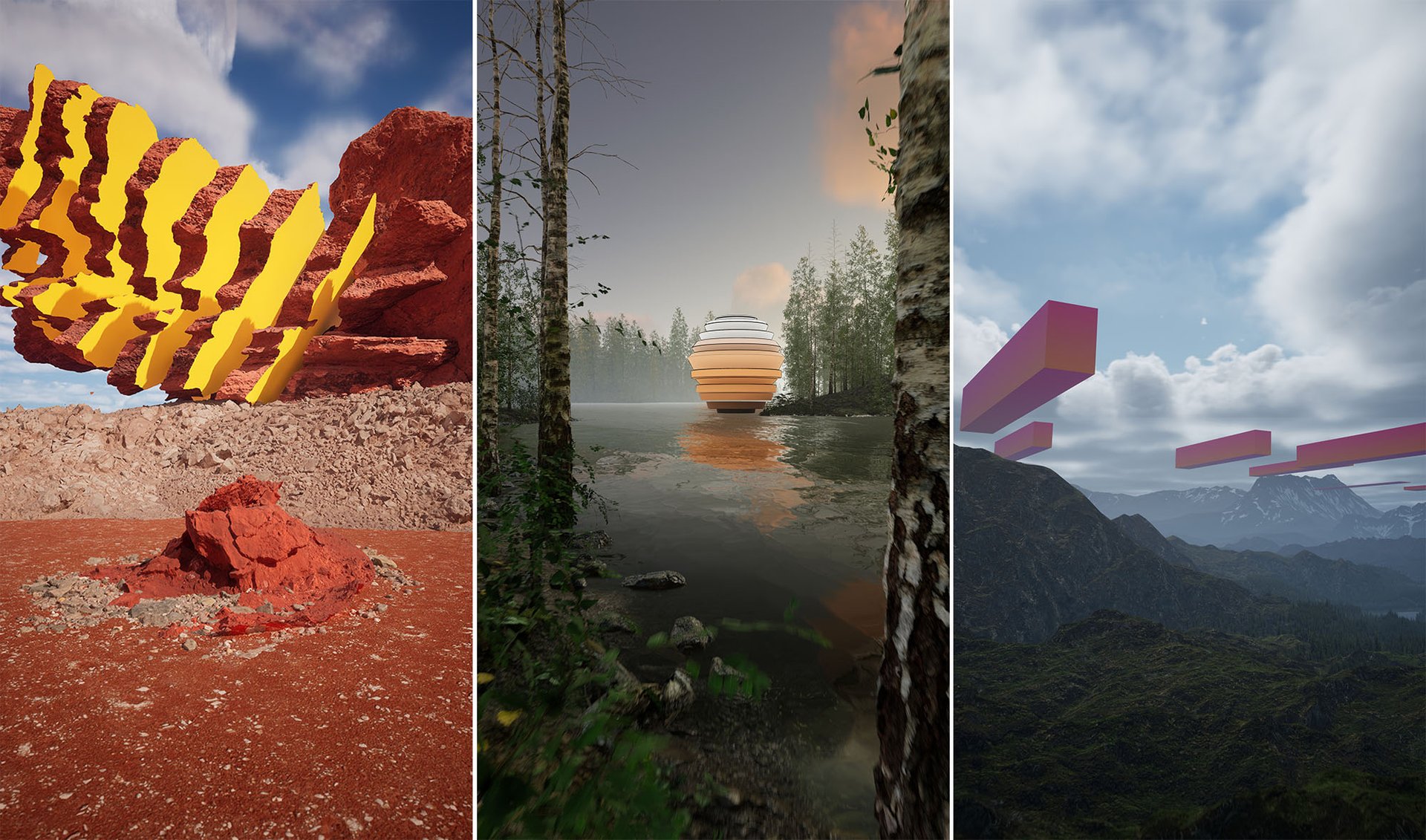 For me this began with the story of what climate action has already achieved. For my latest artwork 50-50 (2022), created in collaboration with the UN Science-Policy-Business Forum and patron Jonathan Lett, I was given access to decades of climate datasets showing the impact of human climate action on critical biodiversity areas. Inspired by the natural world and the utopian architecture movements of the 1960s, I created a symbolic representation of this data as a virtual world in which abstract sculptural and architectural forms interact harmoniously with vast living natural landscapes, with a soundscape by Giovanni Agusta evoking the emergence of hope from melancholy. Data art often takes the form of abstract, flowing, ethereal CGI forms, but Giovanni and I wanted to literally show the data in the landscape, and the audio composition was uplifting in its sense of space and hope.