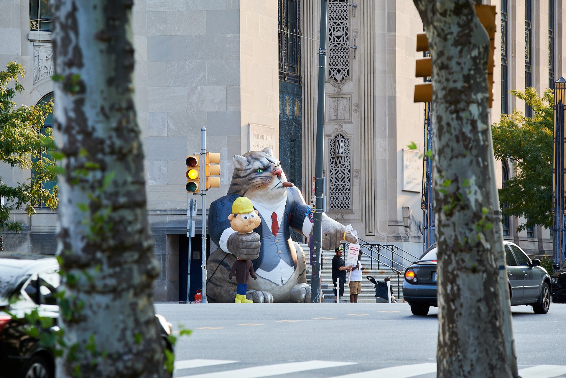 Striking workers and an inflatable protest prop outside the Philadelphia Museum of Art's Perelman Annex on 16 September Photo by Tim Tiebout