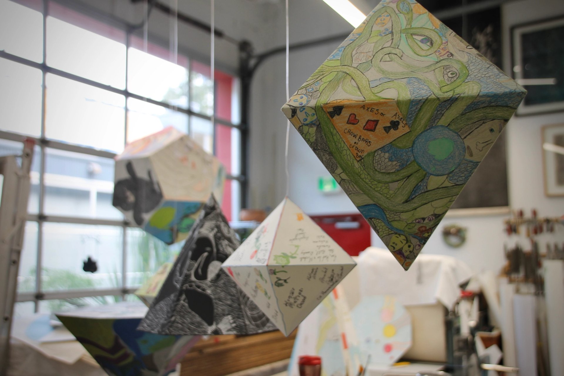 As she works away in the Granville Island studio on drawings that will become geometric mobiles – amplifying the already multi-dimensional quality of her style into actual three dimensions, a semi-finished piece in the shape of a cone stands out. On one edge, a Baffin Island mountain is depicted with the words help us spelled out in stone, speaking to the plight of a people who stand between the colonial damage of the past and the current ecological disaster. But staring intently into the abyss of blank paper as the acrid air moves into the studio, Ashoona just keeps on drawing, a seemingly shamanic act that might just help ward off the wolf of climate change.