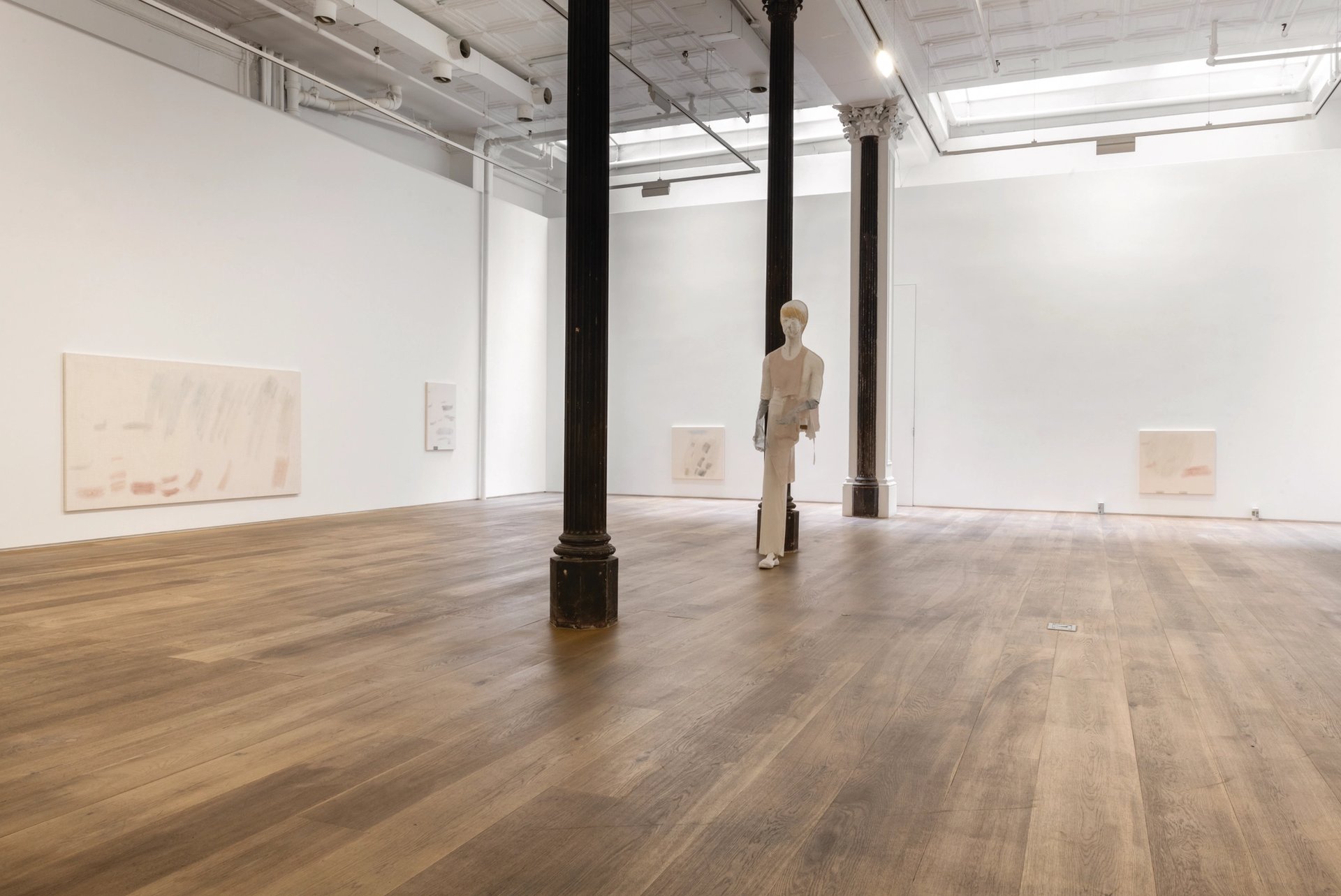 At Ortuzar, her paintings are all hung very close to the floor, just above such forlorn objects as a child’s balled-up sock that sits under a tamped-down abstraction bearing a single silhouette that points to the poignant, mother-daughter relationship grounding the show, though that is anything but obvious. One has to look hard to make out the word “mother” in a deftly brushed painting of what could be a clouded sky. A freestanding female mannequin is partly draped in torn pieces of light fabric. A folded undergarment in a vitrine of “personal objects” speaks volumes about both sculpture and Wilkes's process. The sense of loss apparent in items found finds its equal in an outpouring of love—or so it seemed to me—enormous feelings expressed by an accumulation of almost nothing at all. It’s a private world. One had to trespass its borders to come to grips with it.