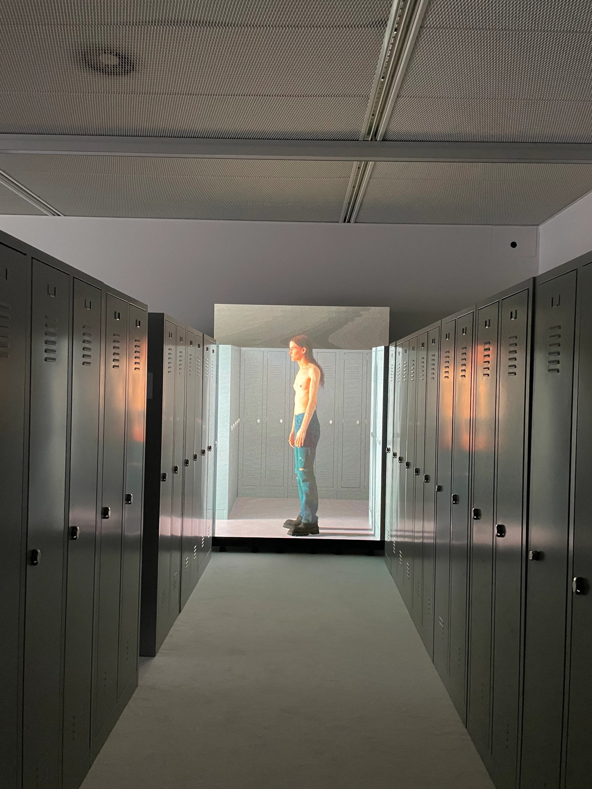 Imhof has responded to this question by creating what she terms "avatars": digitally animated 3D versions of Douglas that appear on screens throughout the show; most are embedded within installations; in one instance, an avatar appears like an apparition at the end of narrow locker-lined corridor. Imhof's use of avatars also allows her to consider fundamental questions about the nature of humanity, and our treatment of those considered non-human. These anxieties she says already existed prior to the Ukraine war, but have only deepened since.
