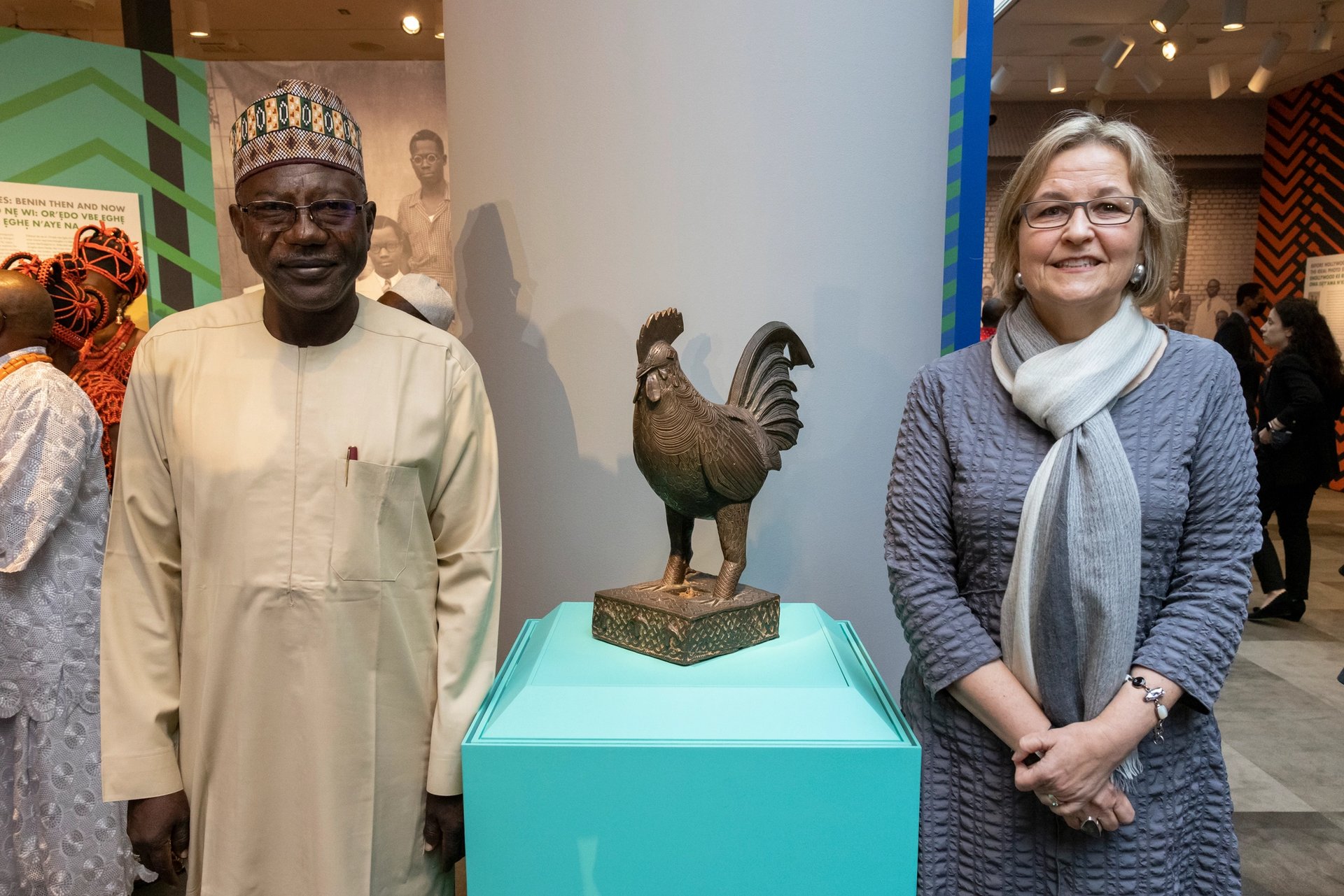 Professor Abba Isa Tijani, Director General of Nigeria's National Commission for Museums and Monuments and Kaywin Feldman, Director of the National Gallery of Art, with a Fowl sculpture previously in the collection of the National Gallery of Art. Courtesy National Gallery of Art.