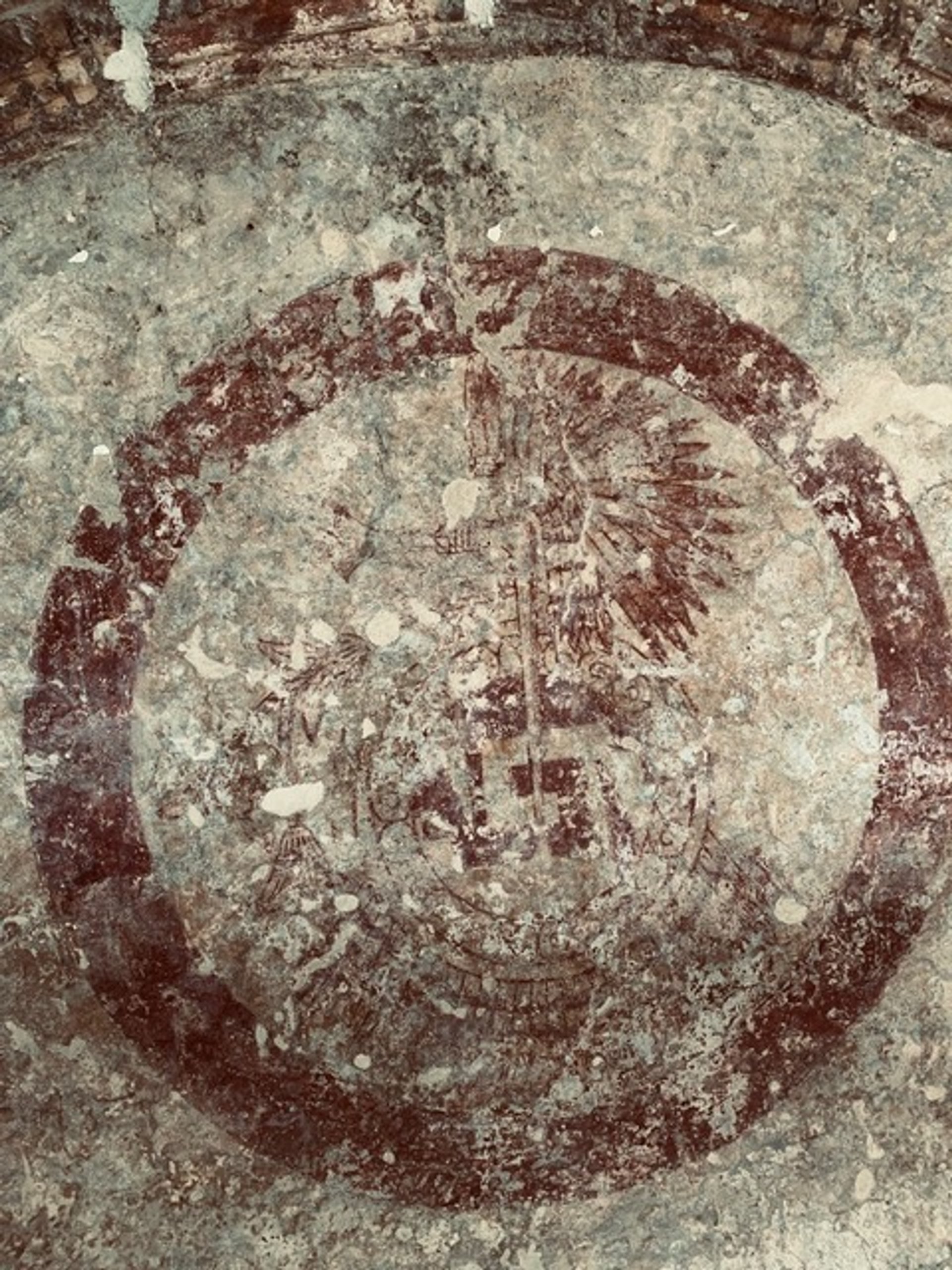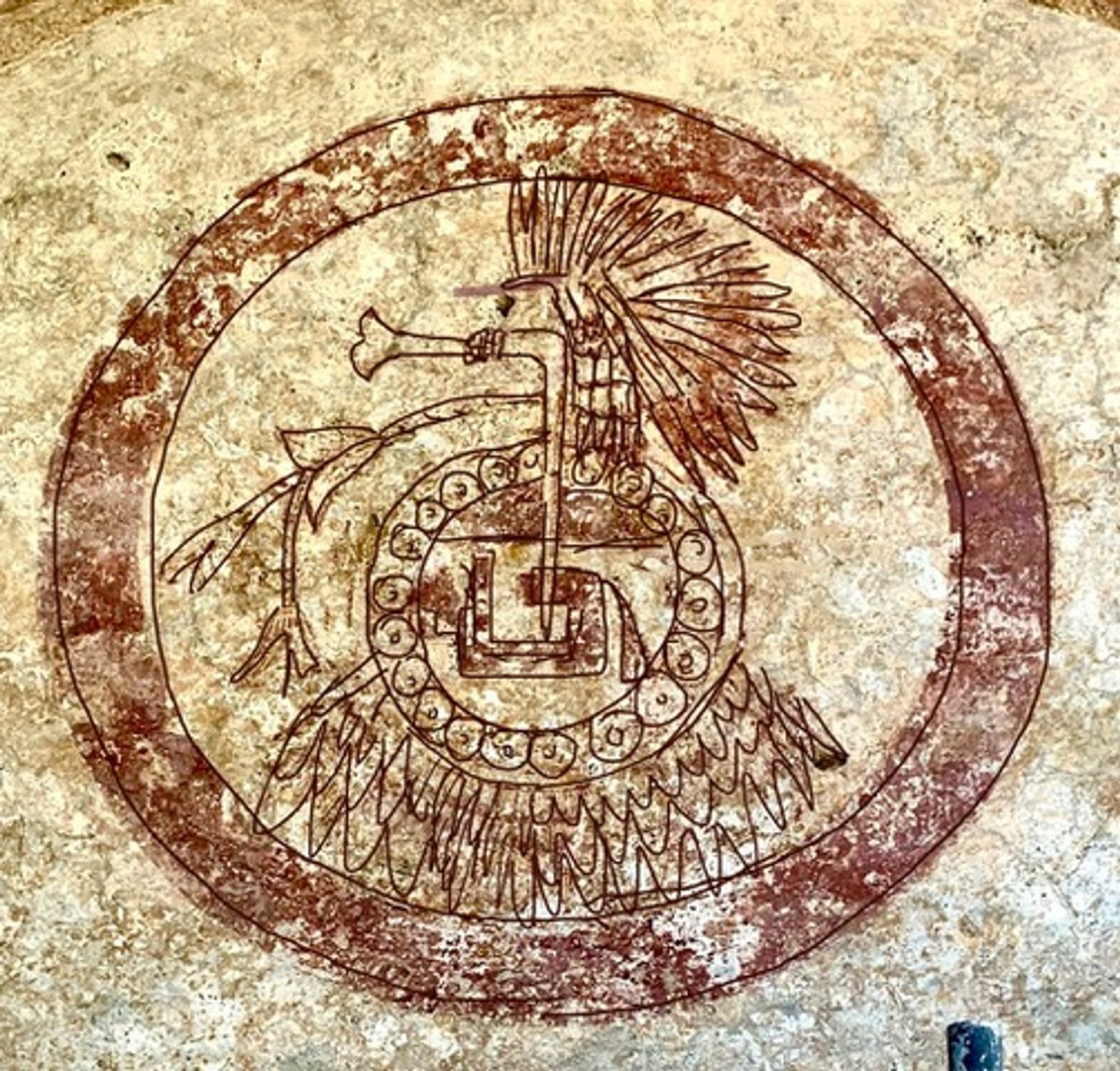The mural consists of a red circle measuring approximately one metre. Within the circle there are renderings of several pre-Columbian images, including an axe, a chimalli or shield, a sprig of flowers and a feathered headdress or “penacho”, which was traditionally worn by a member of the Aztec aristocracy.