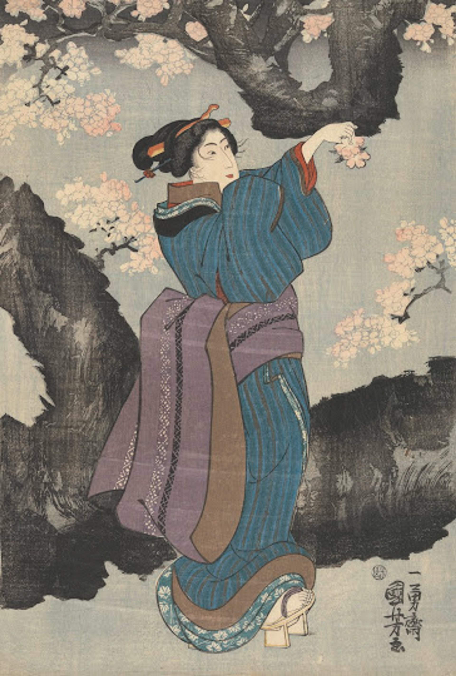 Utagawa Kuniyoshi’s Woman Picking Cherry Blossoms, from the triptych Cherry Blossoms by Night (around 1846) Credit: Van Gogh Museum, Amsterdam (Vincent van Gogh Foundation)