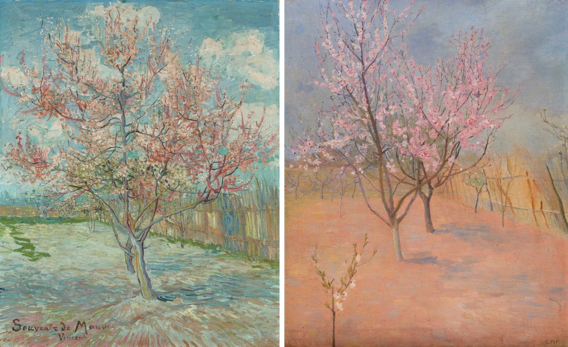 Van Gogh’s Pink Peach Trees (Souvenir de Mauve) (March 1888) and Christian Mourier-Petersen’s Peach Trees in Bloom: Arles (March 1888) Credit: Kröller-Müller Museum, Otterlo and Hirschsprung Collection, Copenhagen