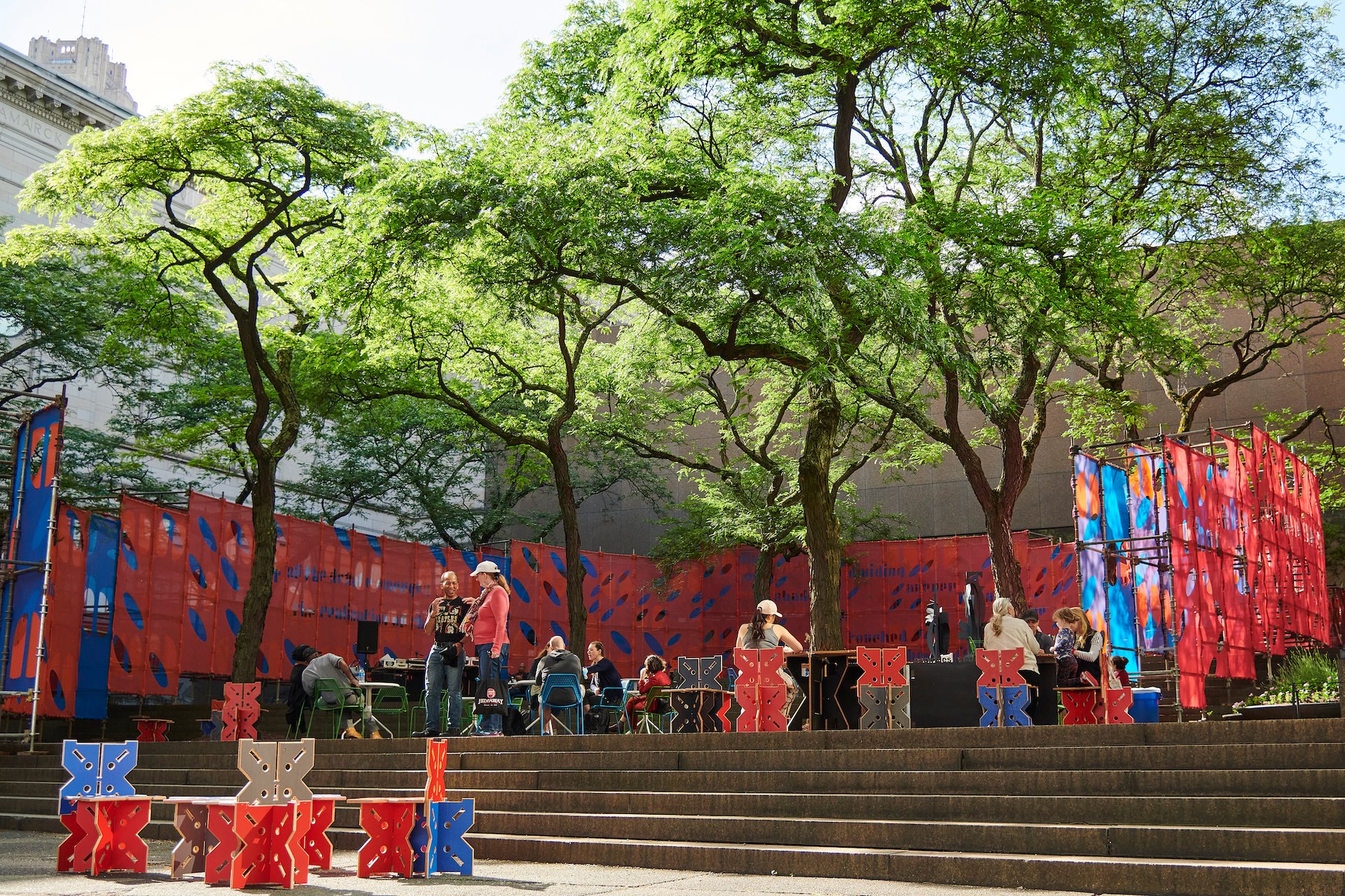 Shaped like an ellipsis that opens outward toward the street behind the museum, Domenech’s installation punctuates the square-frame infrastructure of the Carnegie Museum’s Sculpture Court, creating a space for social engagement. The work, which Domenech refers to as a “collaborative publication”, was constructed from locally sourced scaffolding and overlapping layers of blue and orange construction mesh that was treated as a scroll of paper and run through a laser-cutter to inscribe a collective poem. In his process, Domenech reframes a material designed for dividing space and concealing sites of demolition and development in urban communities as a method for “exposing and creating new possibilities”.
