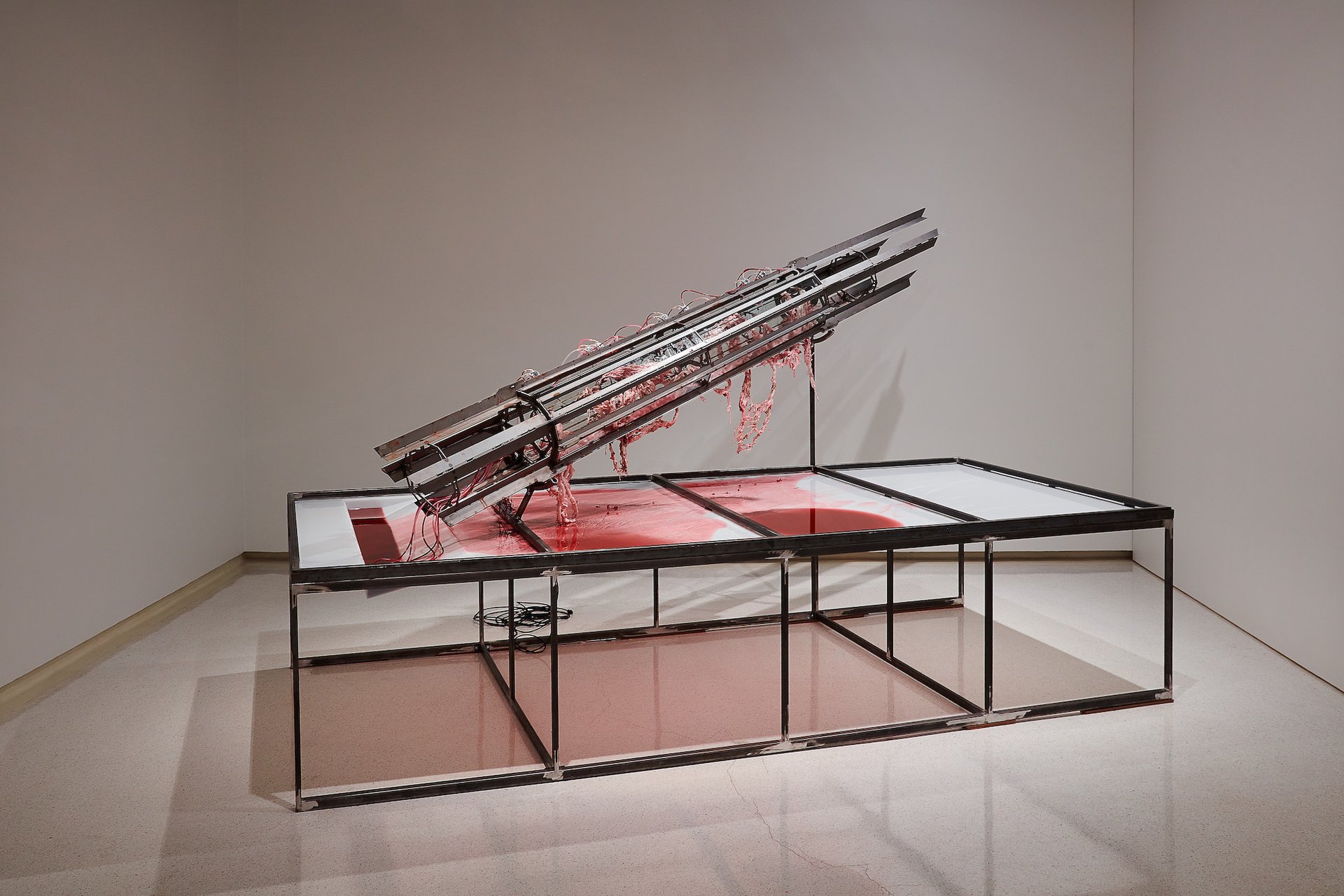 “We tried to follow the works and the thinking of the artists,” says Mohebbi. “It was our aim to acknowledge the interruptions, disruptions, devastations, and fractures of these geopolitical movements while insisting on the aesthetic currents that endured despite such disturbances.” Fittingly, the works included—spanning from a 1945 lithograph map by Louise E. Jefferson (Uprooted People of the USA, 1945) to an evocative steel and glass kinetic sculpture by South Korean artist Mire Lee that churns and excretes a sinuous pink mass of dripping silicone resembling human organs, probing the interplay of accumulated pain and generative beauty (Untitled; My Pittsburgh Sculpture, 2022)—as Mohebbi notes, “overwhelm the ambition of any one organisational intent.”