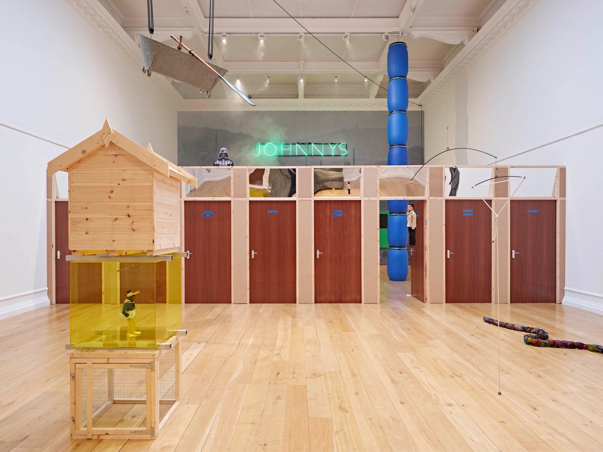 Erected structures and doors, sculptures, moving image and neon light installations comprise Simeon Barclay latest institutional show, which is concerned with inheritance, both familial and cultural. Personal histories—such as his father’s work as a tailor and the artist’s former job as an industrial machinist—are woven together with shared cultural memories. These include the 1979 British cult movie Scum and the landscape and industrial past of Yorkshire (where the artist grew up). Sculptures also make reference to the legacy of art historical behemoths such as Joseph Beuys and Alexander Calder. With its allusions to Huddersfield’s social geography—including the infamous and exclusive nightclub Johnny’s—Barclay brings into focus questions about place, identity and inclusion.