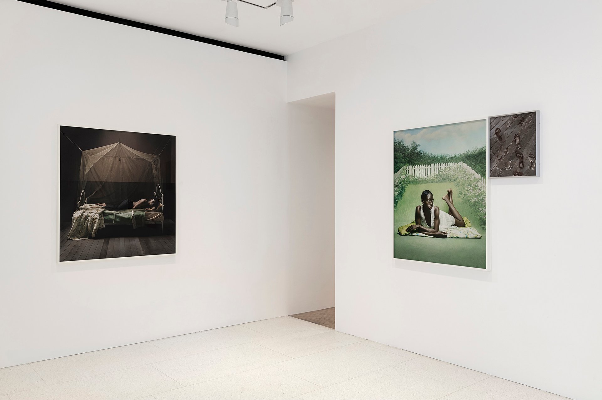 The greenery, present in both the landscape and studio props, presents the American south as quaint idyll as well as historic slave plantation. For Mitchell’s isolated subjects, however, their surroundings provide a cocoon or chrysalis. Sleeping and protected by mosquito nets, in front of a painted garden photo backdrop, suspended in time in a tire swing over calm waters—the works slip into the realms of dreams and utopia.