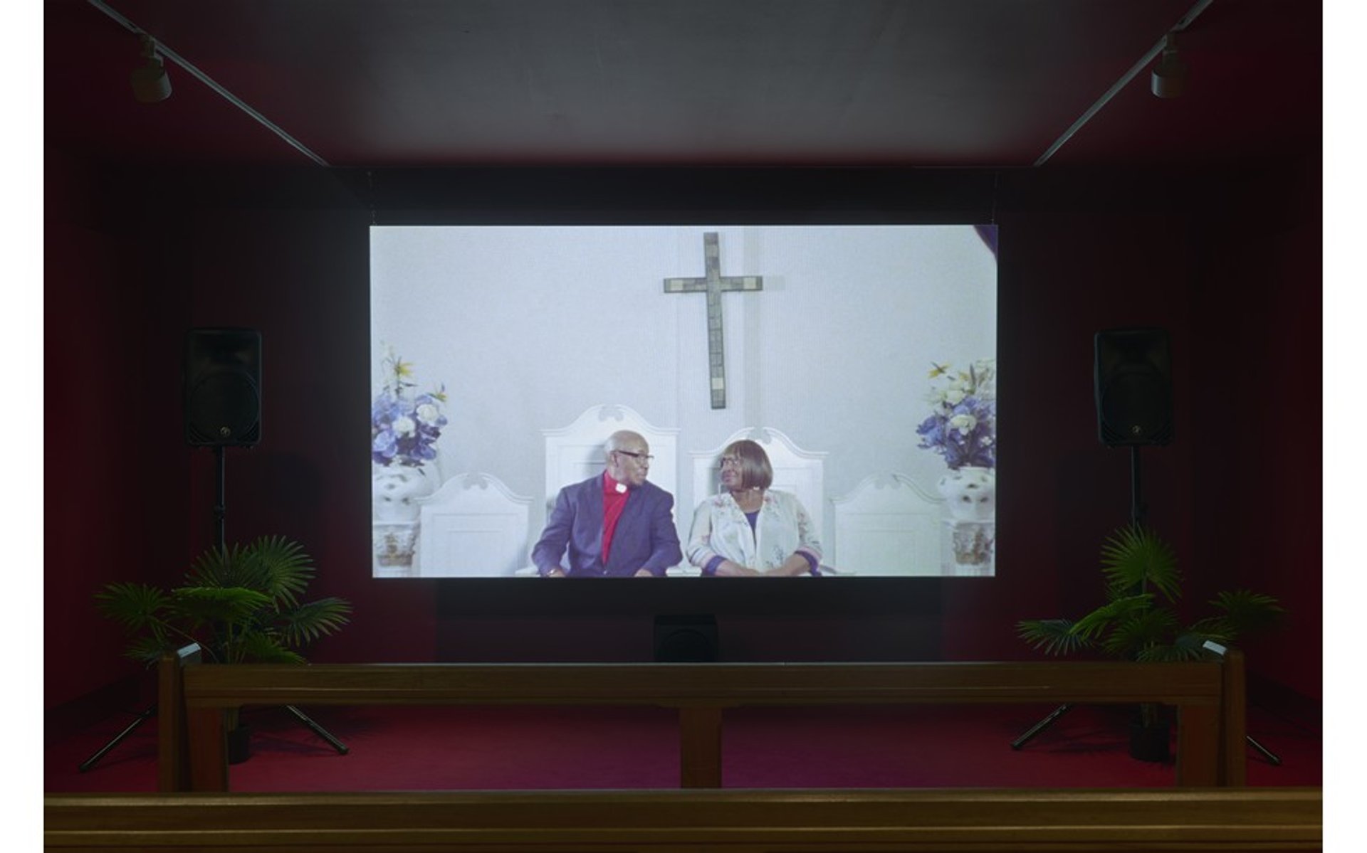 In the latest exhibition at Gasworks in South London, the seat that viewers are invited to use is in fact a pew. Indeed, watching Ufuoma Essi’s new film on the Black Church, it becomes difficult to separate the act of viewing worship from participating in it. To this end, the film occasionally interposes footage of liturgy and song to create an overwhelming sensory environment, underscoring the embodied experience of worship.