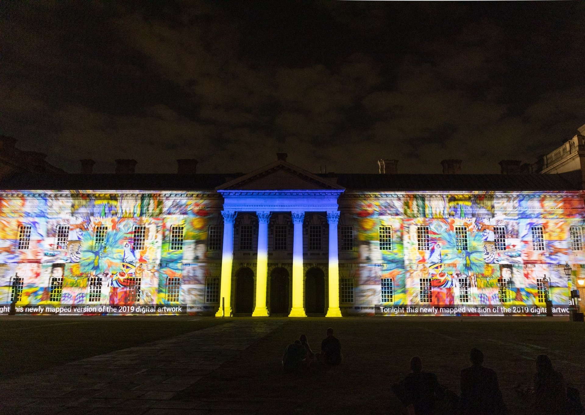 Now-destroyed Ukrainian mosaics projected onto the walls of the Old Royal Naval College Building in Greenwich, London, as part of the UK/Ukraine Season of Culture Courtesy of the British Council