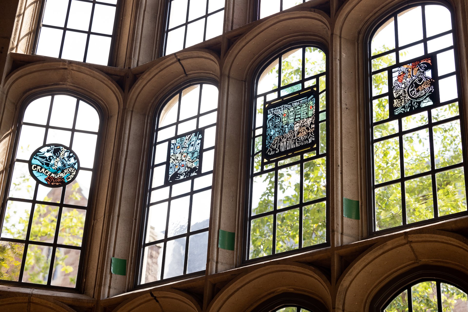 Another one of Thomas’s medallions arose from her discussions with Yale students who wanted to ensure that new windows celebrated the college’s maintenance and kitchen staff. The resulting design, titled From Kitchen to Table, shows four workers standing in the dining hall and is meant to emphasise the centrality of campus workers to student life.