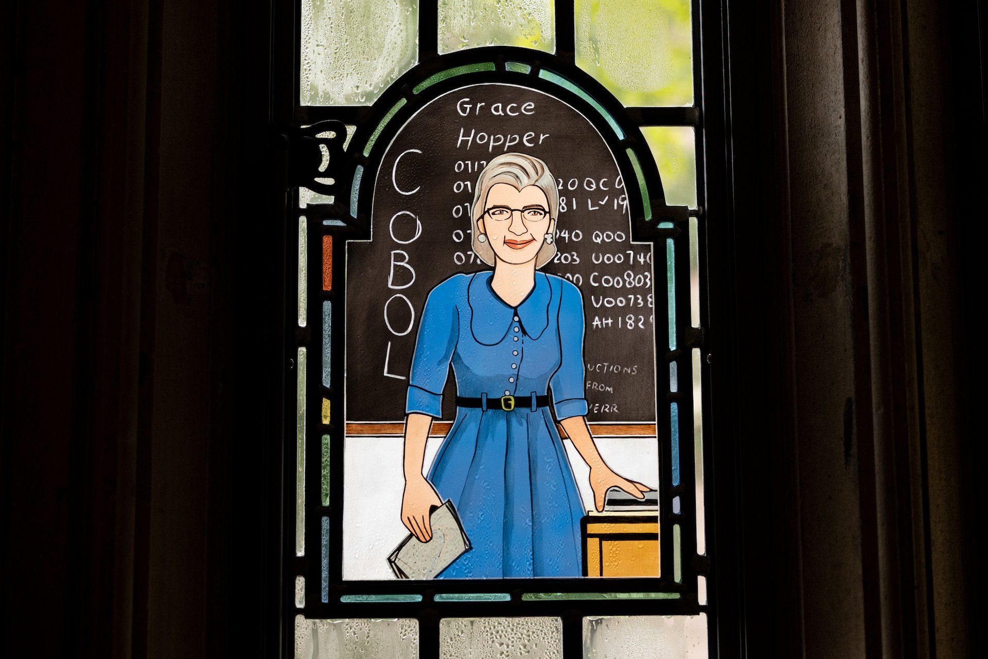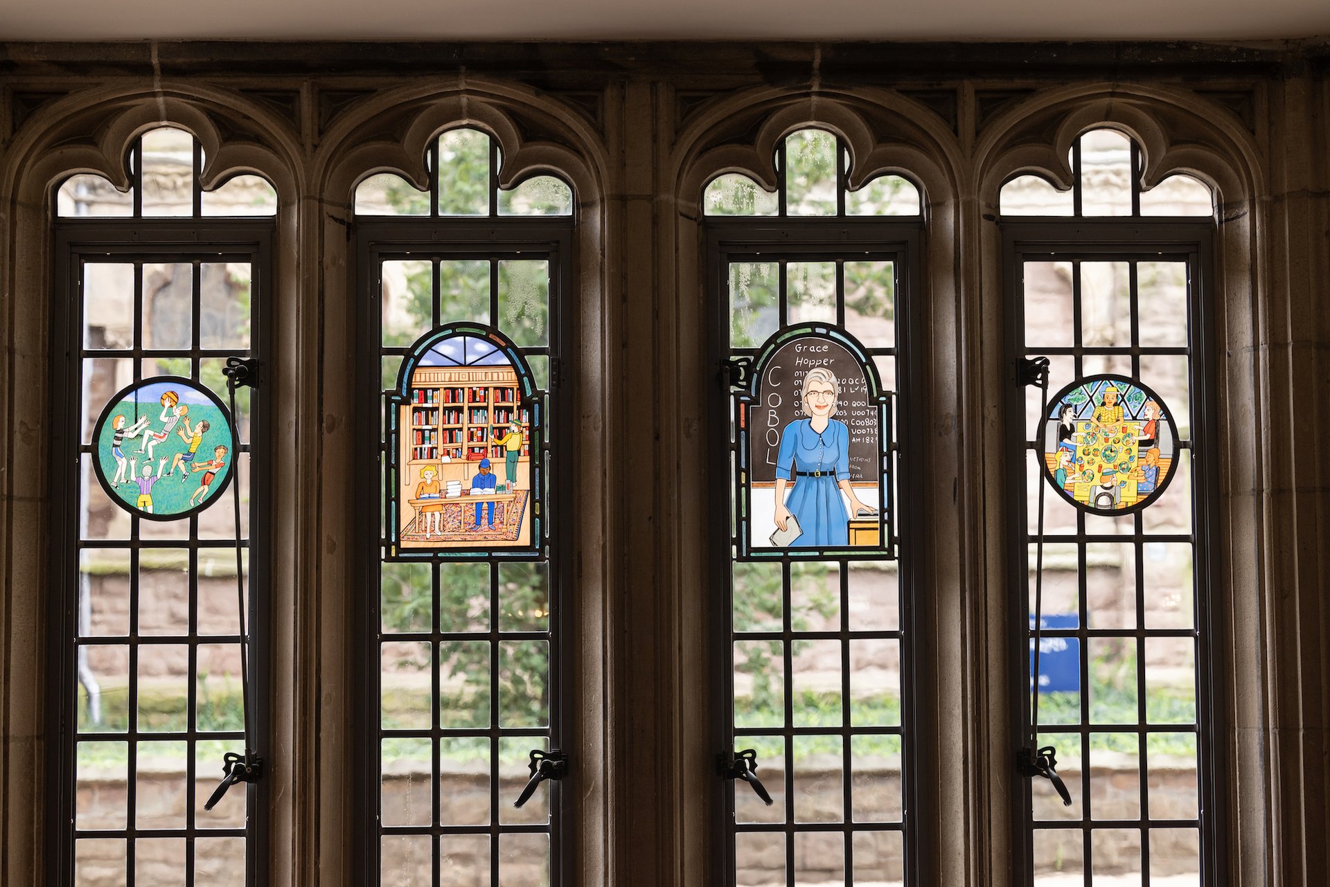 Designed in vivid colour, Ringgold’s windows portray scenes of student life, from a potter seated at a wheel to a group playing basketball outdoors. One pays tribute to Hopper, who taught at Vassar College before being appointed as a research fellow at Harvard University, in front of a chalkboard inscribed with the letters COBOL—referring to the standardised programming language she co-developed.