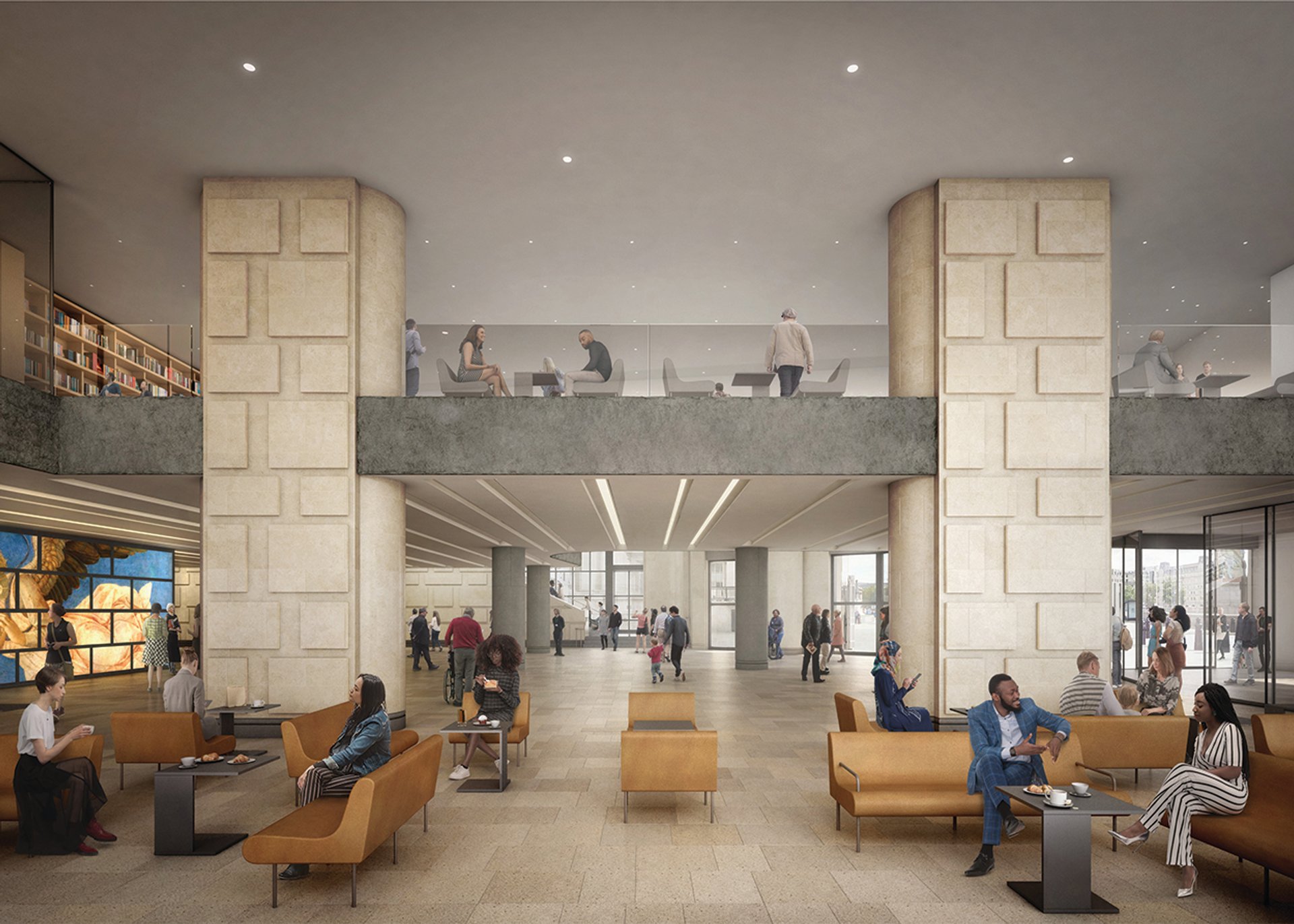 Inside the Sainsbury Wing, the space of the entrance vestibule will be practically doubled while retaining the distinctive Mannerist qualities and pietra serena and limestone materiality of VSBA’s architecture. By cutting away a part of the first floor, the vestibule rises to double height on the east and west sides while still preserving the sensation of compressed space in the centre, making the first floor a proper mezzanine level and offering fascinating views within the building and onto Trafalgar Square.