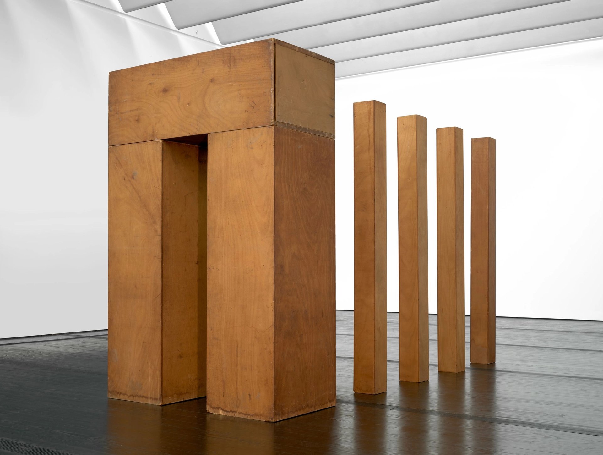 He briefly operated a gallery in downtown New York with the artist Robert Whitman, where he exhibited minimalist plywood sculptures that were sometimes inscribed with directions encouraging viewers to undertake tasks with no productive outcome—or what he aptly described as “meaningless work”. For example, Ball Drop (1961-64) asks viewers to drop a ball through the square opening of a tall plywood box to create a sound, while the monumental installation The Arch (1964) immerses the viewer within tall wooden columns, creating an inexplicably transcendental environment through simple geometric stacks.