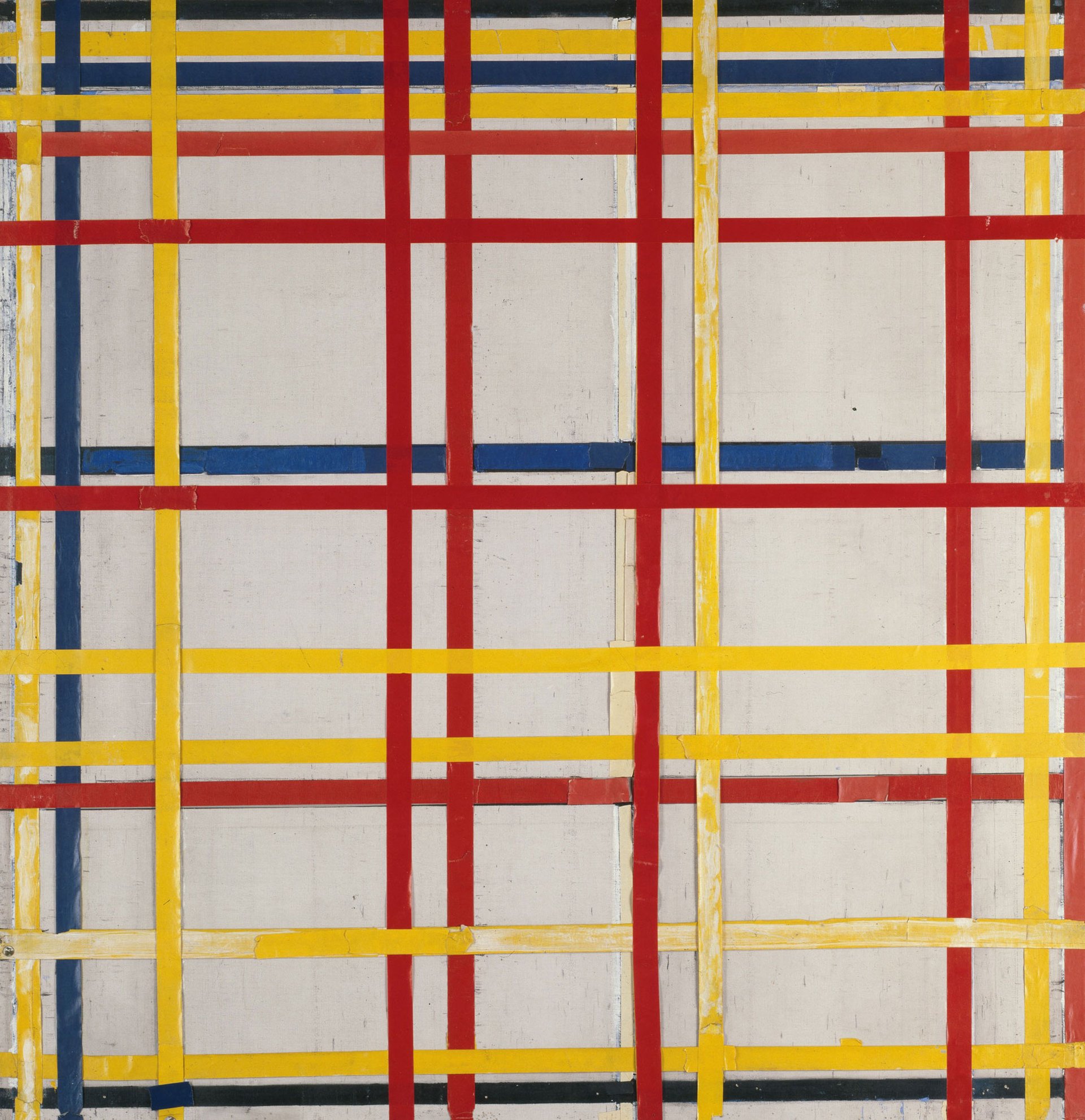 New York City I (1941)—an abstract work composed of vertical and horizontal lines in red, yellow and blue—has been displayed with its five most densely spaced lines at the bottom of the picture since 1945. However, the work is orientated the other way in a photograph taken in Mondrian’s studio shortly after his death in 1944, showing the closely spaced lines at the top.