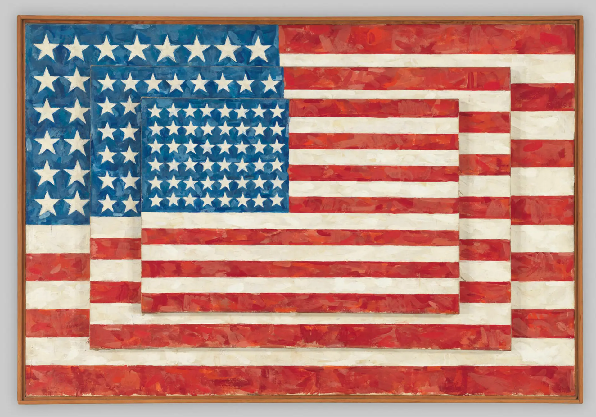 There’s no stretching in the half-dozen glossy panels at Sprüth Magers, where Lawler took a different approach, literally blurring the transformation of the American flag from a trusted symbol of democratic unity into the standard of rabid nationalists. The single example is Three Flags (1958) by Jasper Johns.