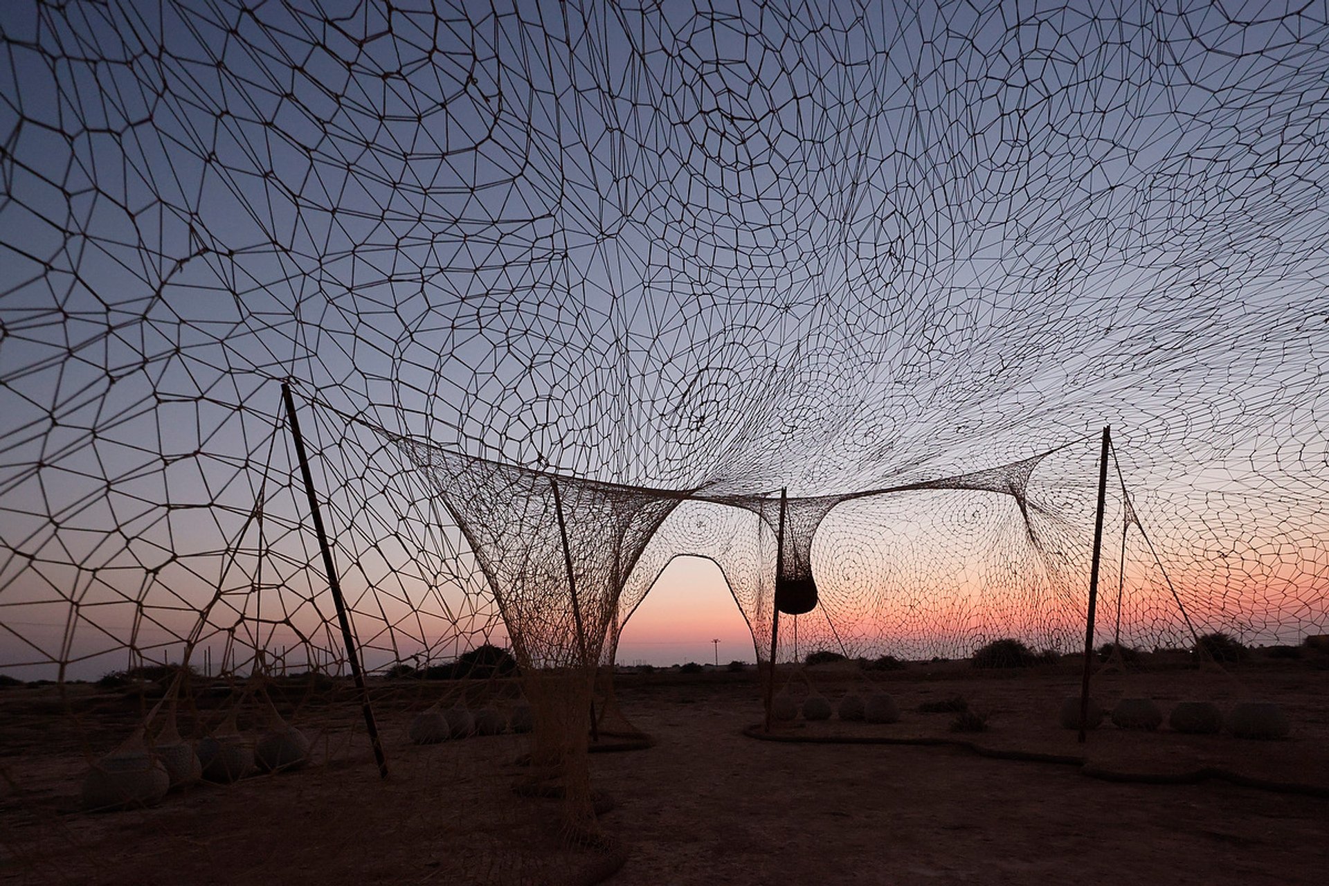 Brazilian artist Ernesto Neto’s crochet environment, also located in the northern desert, invites visitors to enter inside an octagonal football goal with a ceramic globe at its centre. Open to the elements, it is intended as a place of meditation and communion: between human beings and the desert and between people of different nations.