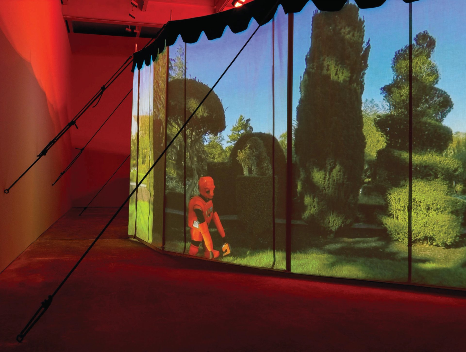 Practical Effects marks a critical departure from Thater’s previous practice. It’s the first time she has worked with representations rather than live animals. However, they are actual shrubs that live in the Green Animals Topiary Garden of Newport, Rhode Island. Still, who can tell the real from its simulation anymore? As someone who has yet to be persuaded that virtual or augmented reality can be good for art, it was nice to hear that Thater’s robot was no Shrek, but a handmade, analogue creation. In Hollywood parlance, it’s a practical effect—in this case, a costumed actor, like the Tin Man, or R2D2 of Star Wars fame. This is also the first time that Thater has featured a species she never depicted before, even if it is a stand-in. (In her film’s projected future, humans either have died out or gone to Mars.)
