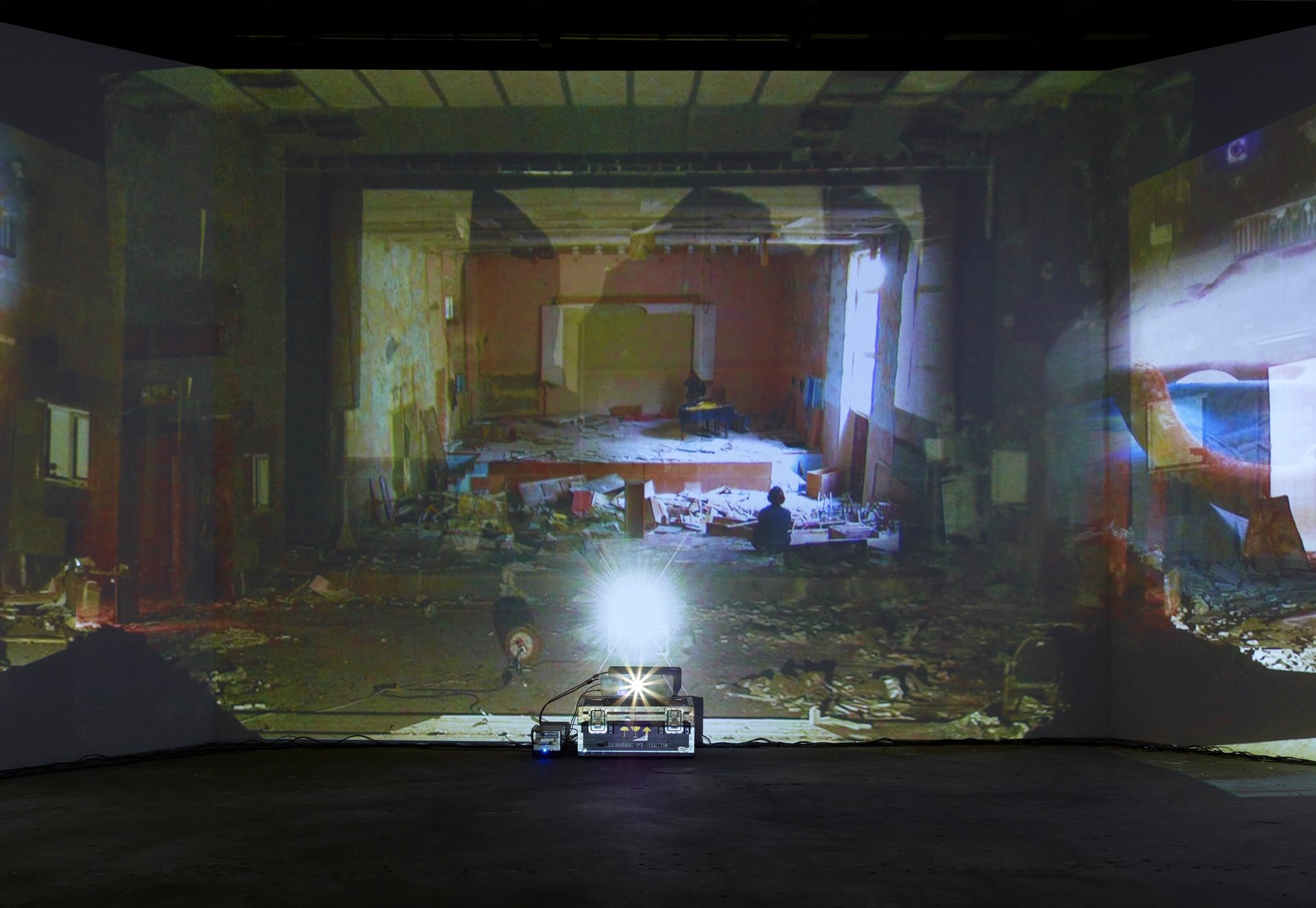 But the filming, the travel, and the concerns of her work are not all that sets Thater apart as an artist. While she cites Bruce Nauman’s Clown Torture (1987) and Dara Birnbaum’s pioneering use of equipment, video walls and shifts of scale as important to her development, Thater’s meld of architecture, coloured gels, and moving image are her own invention. For example, the only source of the otherworldly lighting and irradiated hues of the Chernobyl piece was the video itself. Like Practical Effects, it plays within a structure that Thater designed to intensify its impact on viewers.