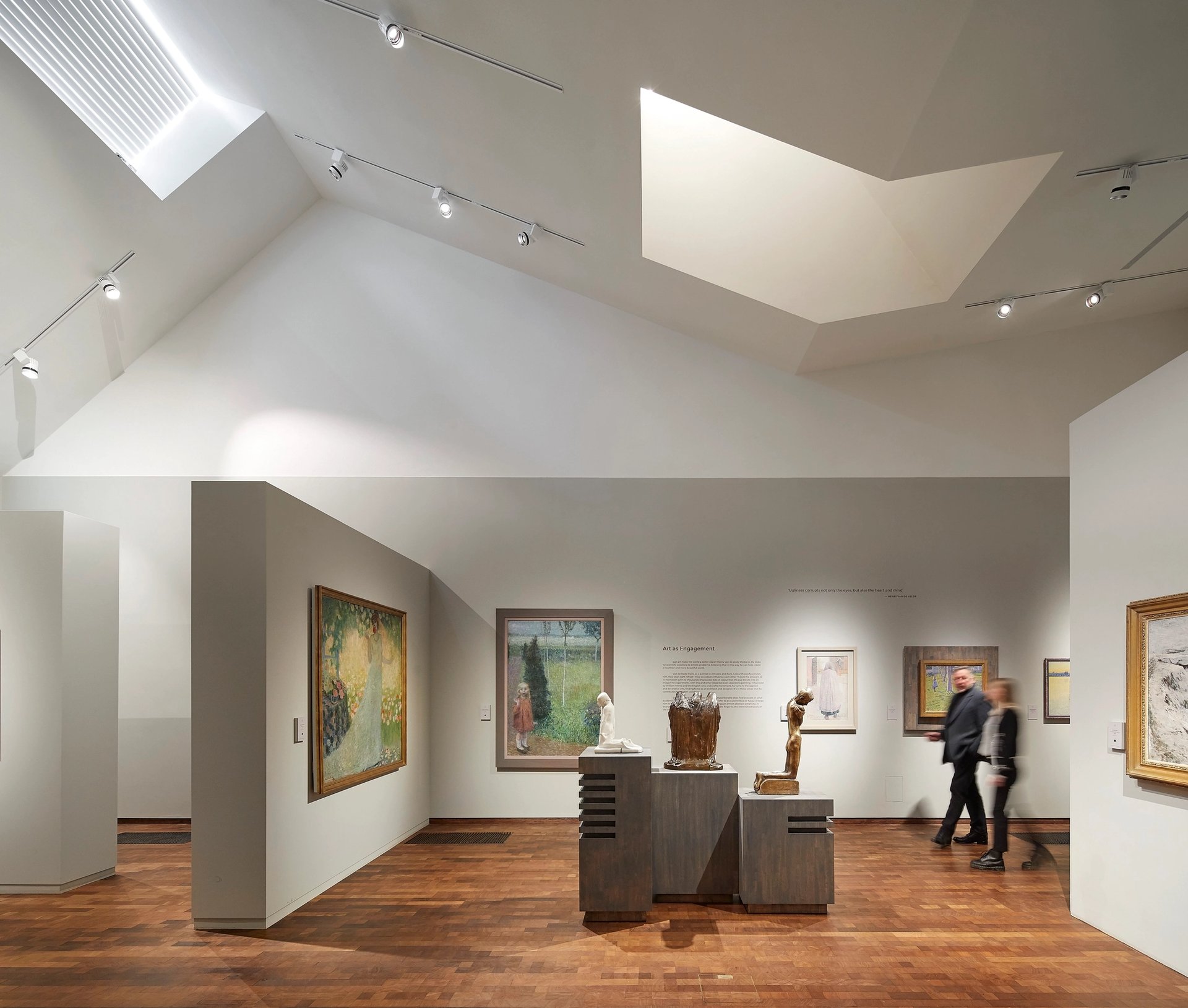 Through the spacious new museum entrance, visitors will be guided through two small galleries and one very large temporary exhibition gallery, which will act as a temporary home for major loan shows, and a permanent gallery hung with specially woven dark green silk damask donated by Humphries—one of three surviving mills in Sudbury—for the museum’s own major Gainsborough collection. Further galleries in the original house provide enough room for two special collections: works gifted by the estate of the local artist, Cedric Morris—Hambling is a trustee and former student—and a personal collection related to Suffolk’s other famous painter, John Constable, on long-term loan from his descendants.