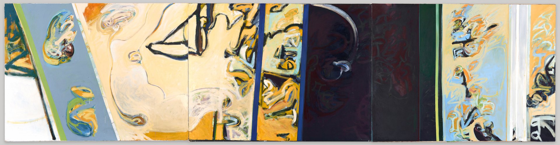After that trip she knew she wanted to concentrate on her own art again, and moved to the rural town of Philo, California. Bing worked until her final years. She died in 1998 at age 62, following a battle with lupus and hemochromatosis. Her bold triptych Epilogue (1990-95), six feet tall and 24ft wide—is from that late period. It is comprised of a series of vertical sections, with bundles of expressive, rather light-hearted painting throughout, then a rather mysterious patch of blue-black that spans the second and third panels. “She named it Epilogue because she was using this as a way to say goodbye,” Chen says. “It was kind of a summary of where she was at that time.”