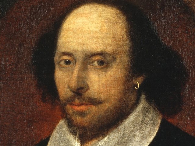 The figure portrayed is a bearded, balding man in shirt and doublet, with the top left and right of the canvas helpfully inscribed 1608 and AE (aged) 44 – the correct age for the playwright at the time.