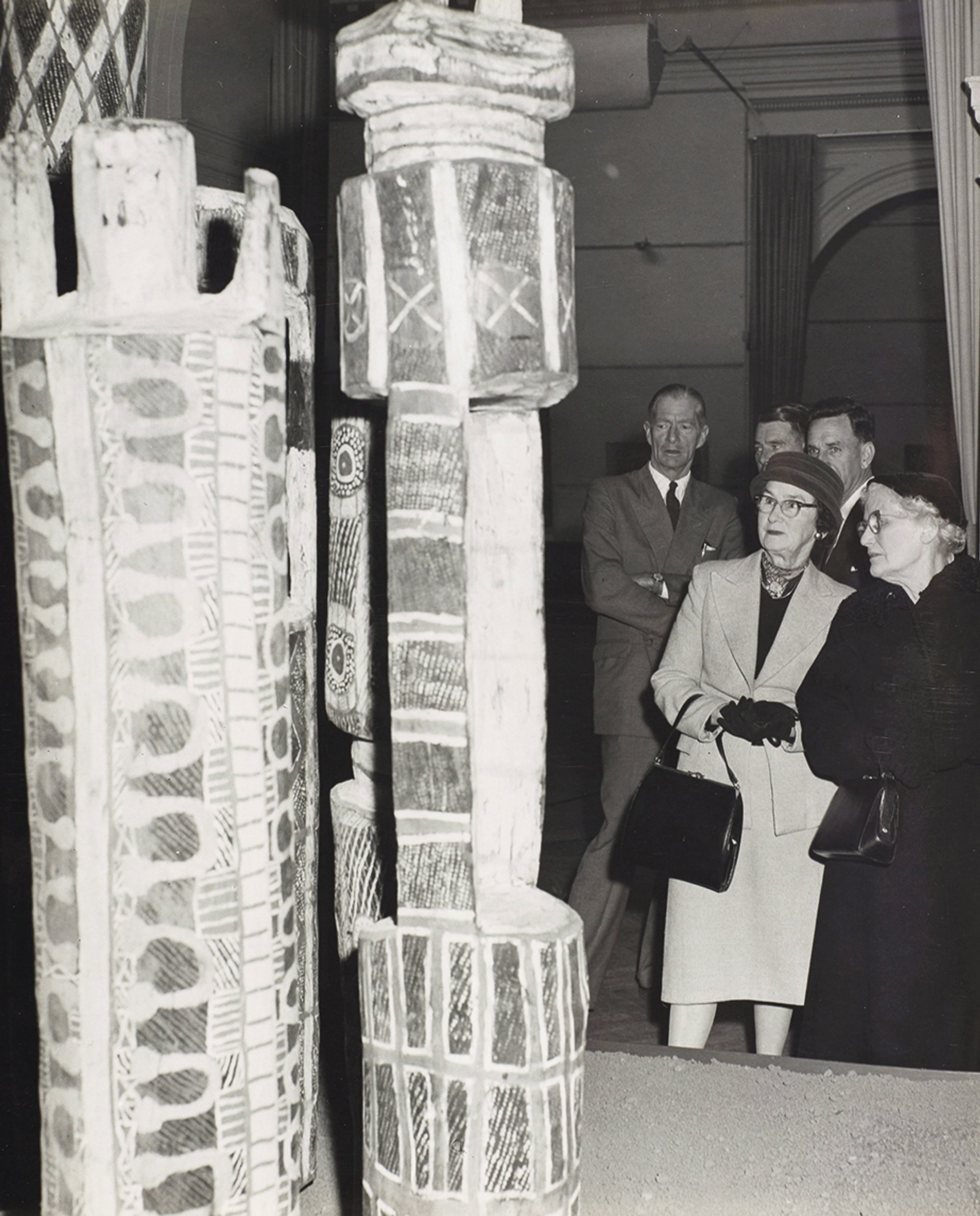 Guests at the ceremony to mark the installation of the Tutini (Pukumani grave posts) at the Art Gallery of New South Wales, 18 June 1959 Photo: AGNSW; © Estate of Max Dupain/Copyright Agency