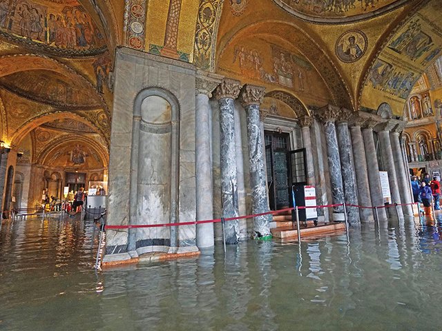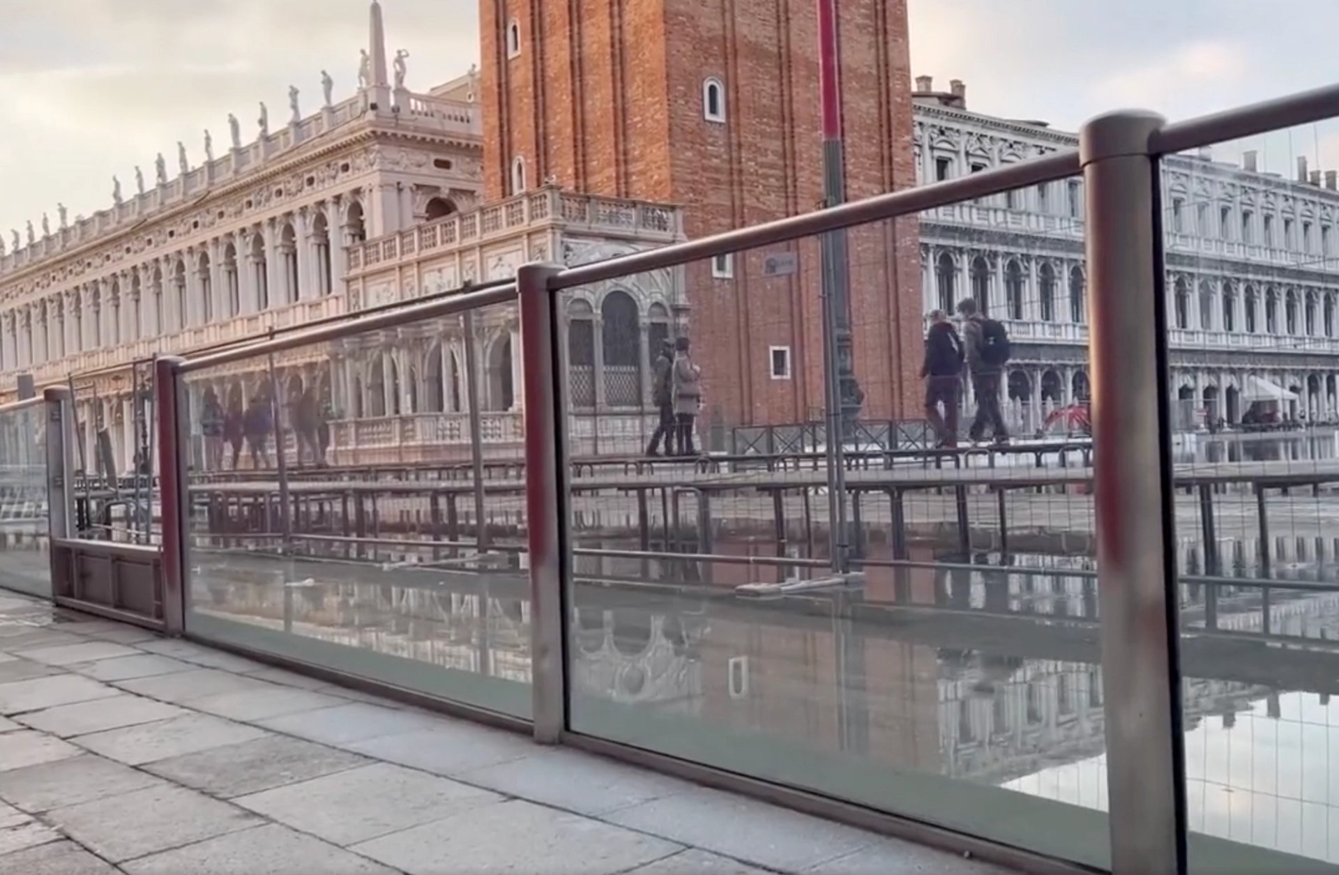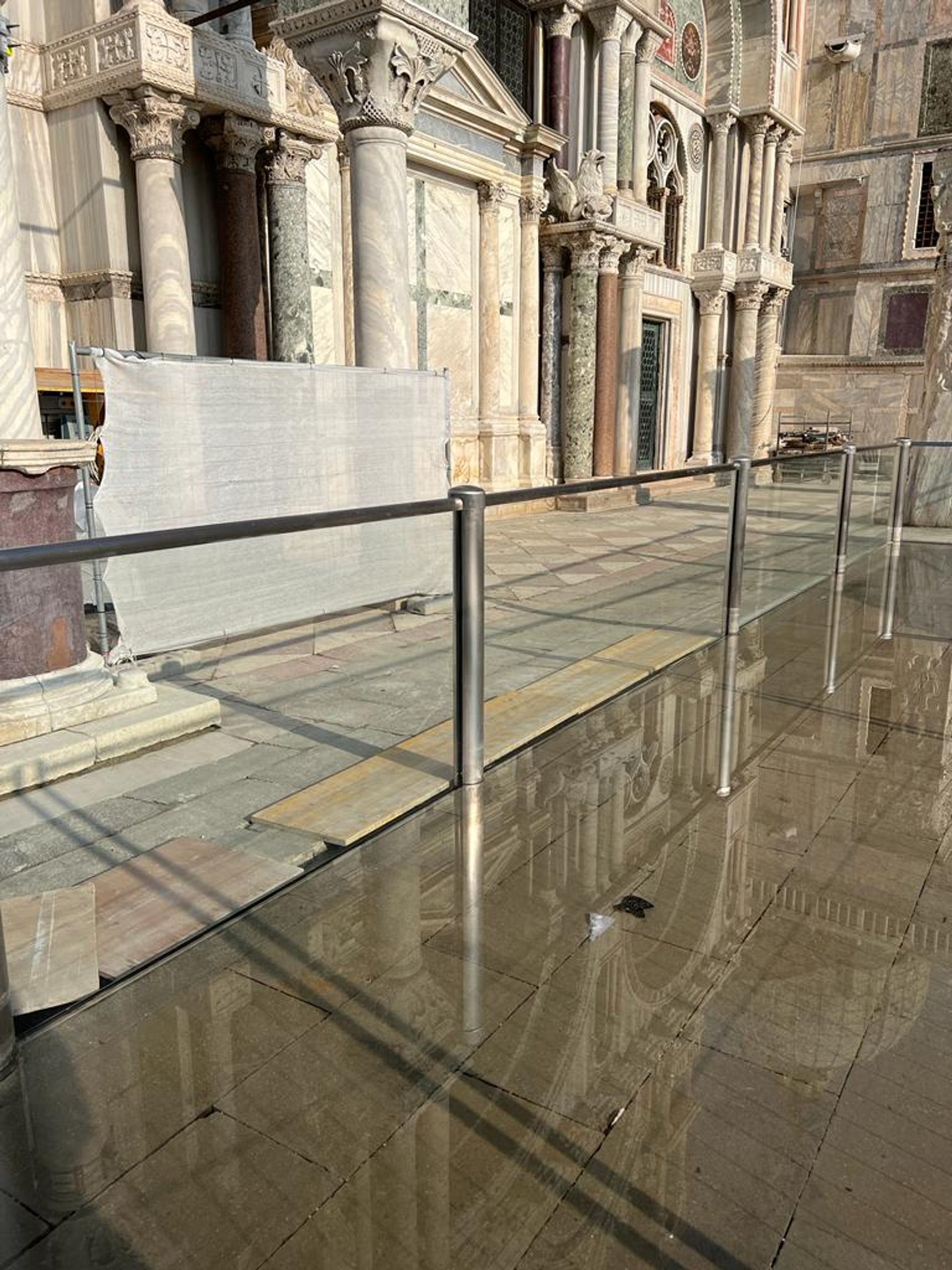 St Mark’s basilica, the most famous and splendid monument in Venice, is now protected by its own small flood barrier, a fixed wall of glass that prevents water in the square from invading the 1000-year old church as it has done hundreds of times over the last decades.