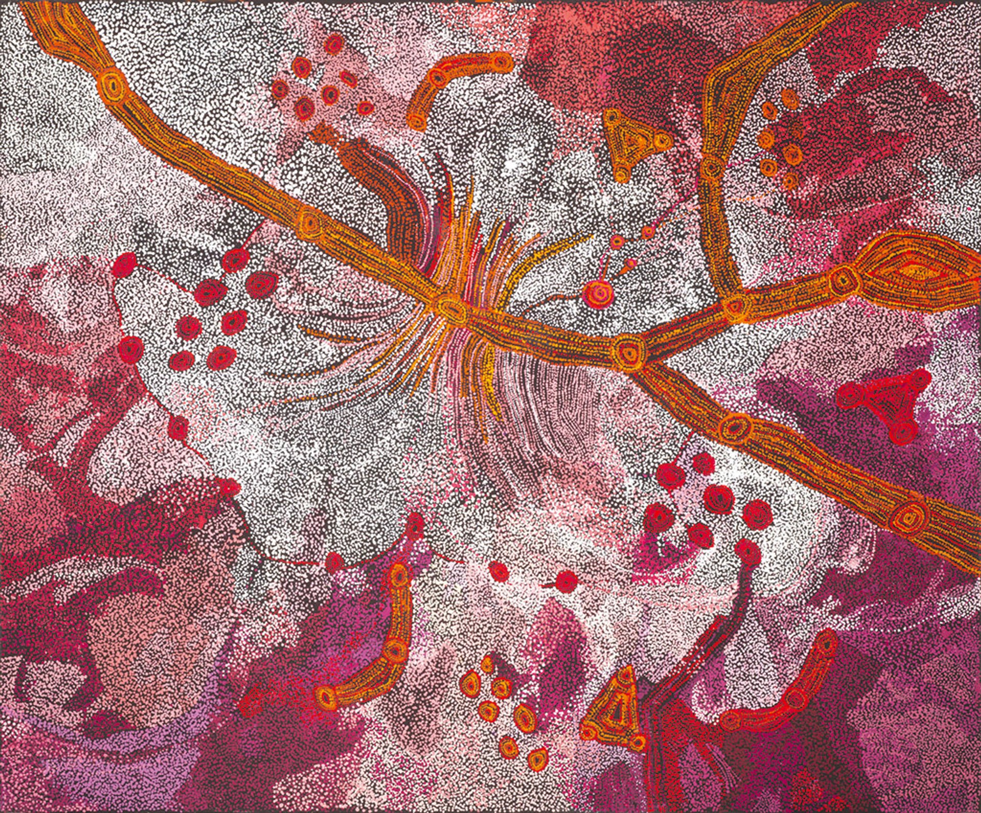 This work is from the southern desert region. Ken is depicting Country, and when you speak about Country, it includes everything, even the stars. In this particular work, seven sisters travel the night sky, attempting to flee unwanted attention from an older man; the sisters are actually the Pleiades and they’re being chased by Orion. It is another way of understanding our world when we step outside our homes and look up. And that is the strength of Indigenous art. But also you have that incredible use of colour; the composition is absolutely perfect; the line work is exquisite. It could be anything, but we are also told what the stories are.
