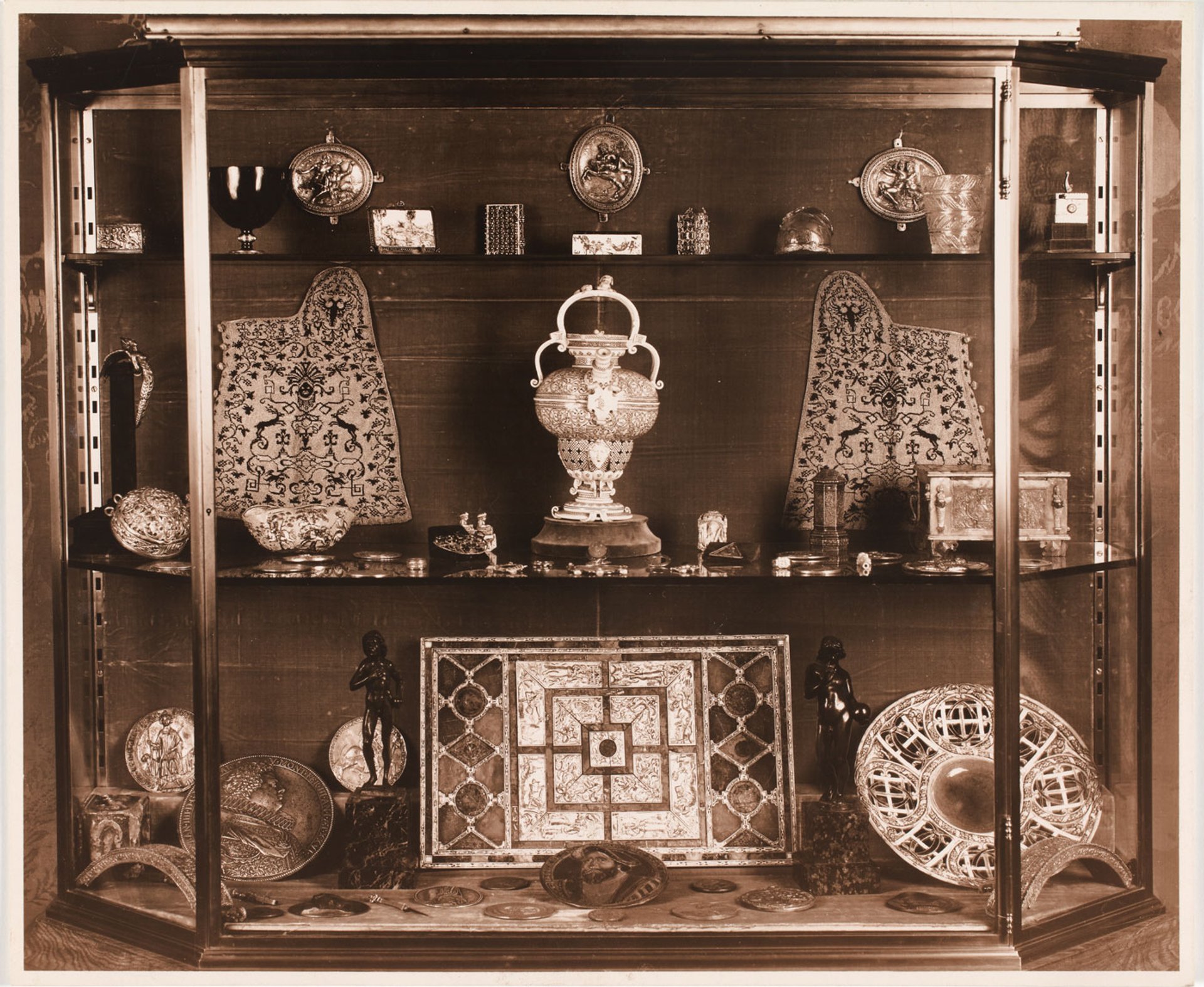 One of the vitrines that Béhague filled with rarities of all ages and countries at Hôtel de Béhague, her treasure house in Paris. Its contents include a medal in gold of Marie de Medici (bottom left), c. 1610-14, and (centre) a Saint-Porchaire faience drinking vessel with the emblems of Henri II and Diane de Poitiers, c. 1530-40