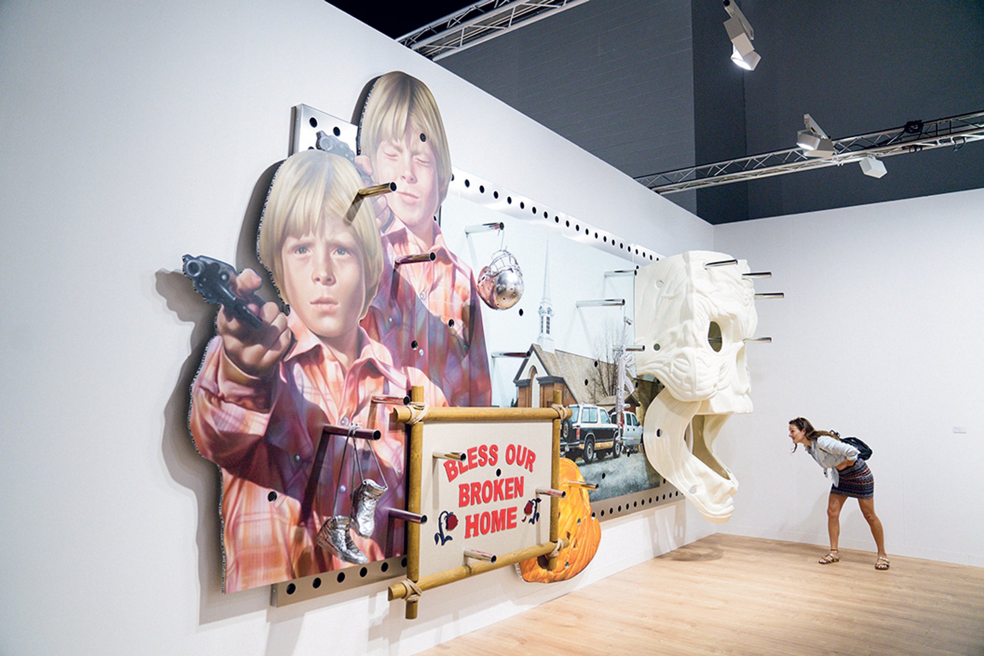 As part of her retrospective, Lautenberg is also showing Guns Kill (2022), a piece that superimposes the Statue of Liberty over images of AR-15-style rifles. The work was created to benefit Giffords, an organisation dedicated to saving lives from gun violence led by former Democrat Congresswoman Gabrielle Giffords, who was seriously wounded in a mass shooting in 2011.