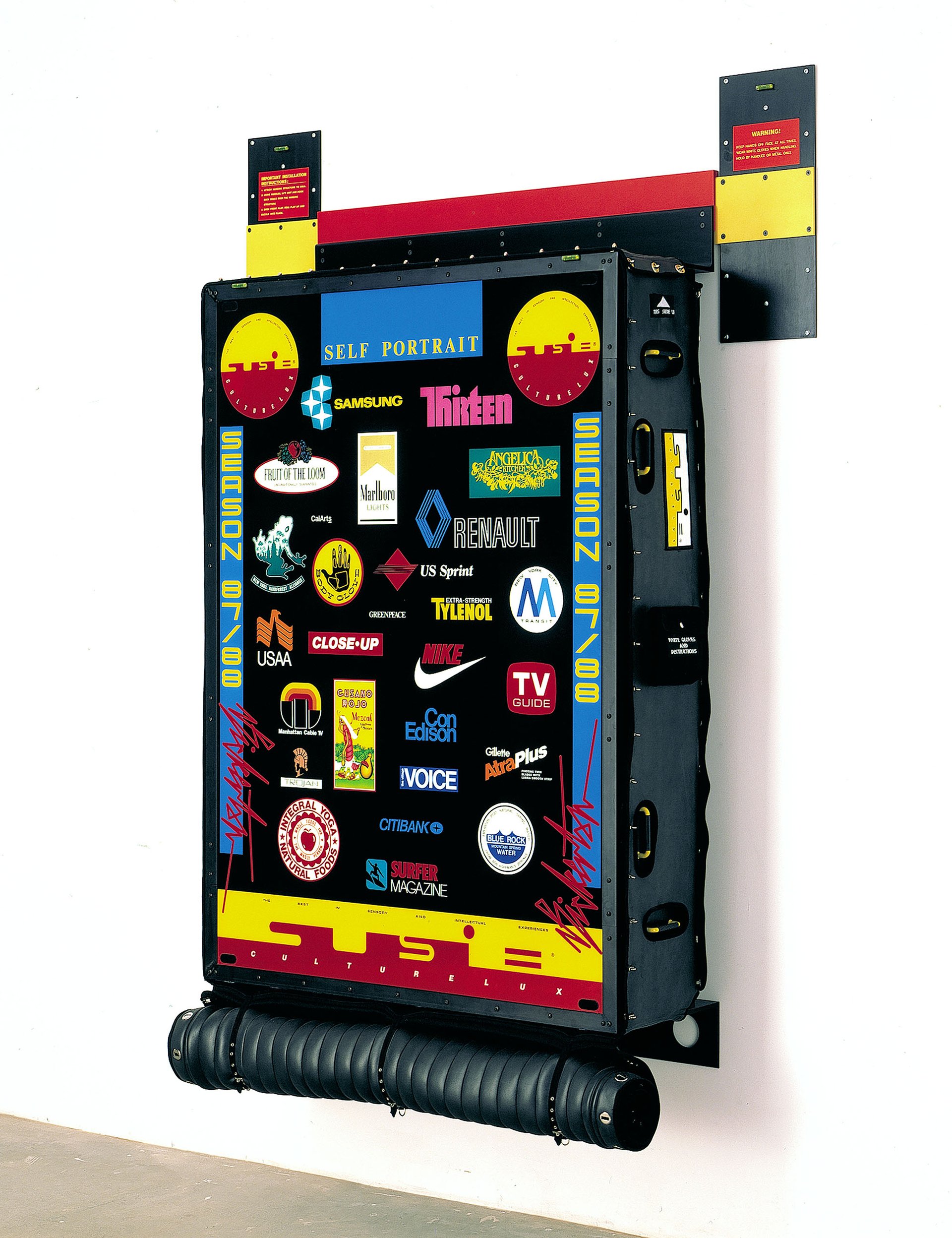 The works that Bickerton created in New York were slick, slippery things that fused painting, sculpture and corporate branding into sly assemblages that took aim at America’s consumer culture. His wry conceptual approach is encapsulated in a work like Tormented Self-Portrait (Susie at Arles) #2 (1987-98), in which the titular self-portrait is a collection of corporate logos, which Bickerton figuratively signed with his brand identity alter ego, Susie Culturelux. This deadpan discipline would eventually be woven together with the work of Bickerton’s East Village contemporaries such as Peter Halley and Jeff Koons into the movement dubbed Neo-Geo, although Bickerton preferred the term Commodity Art. For much of the 1980s, Bickerton found increasing critical and market success.